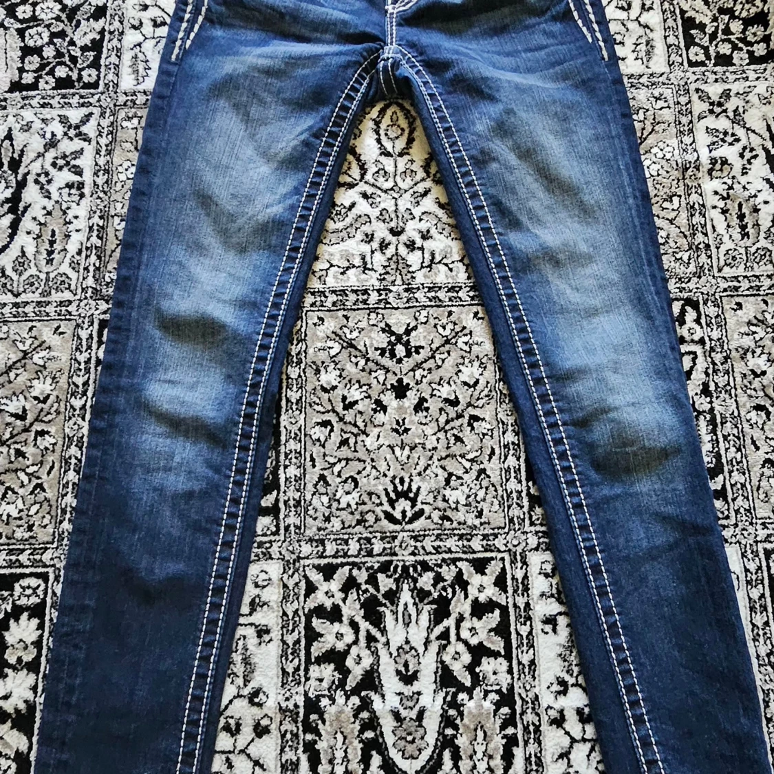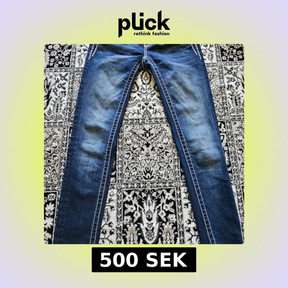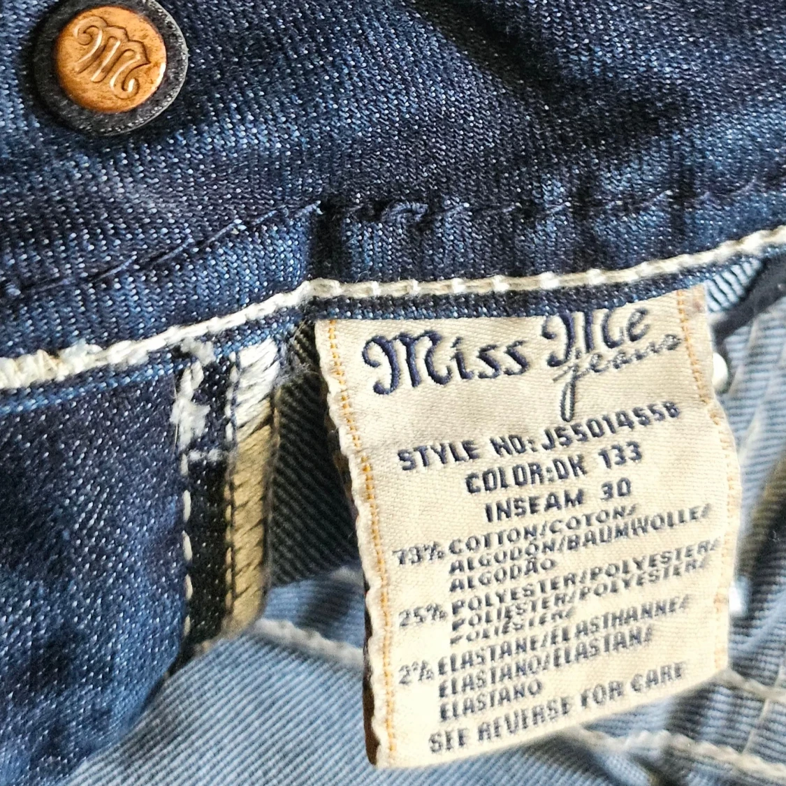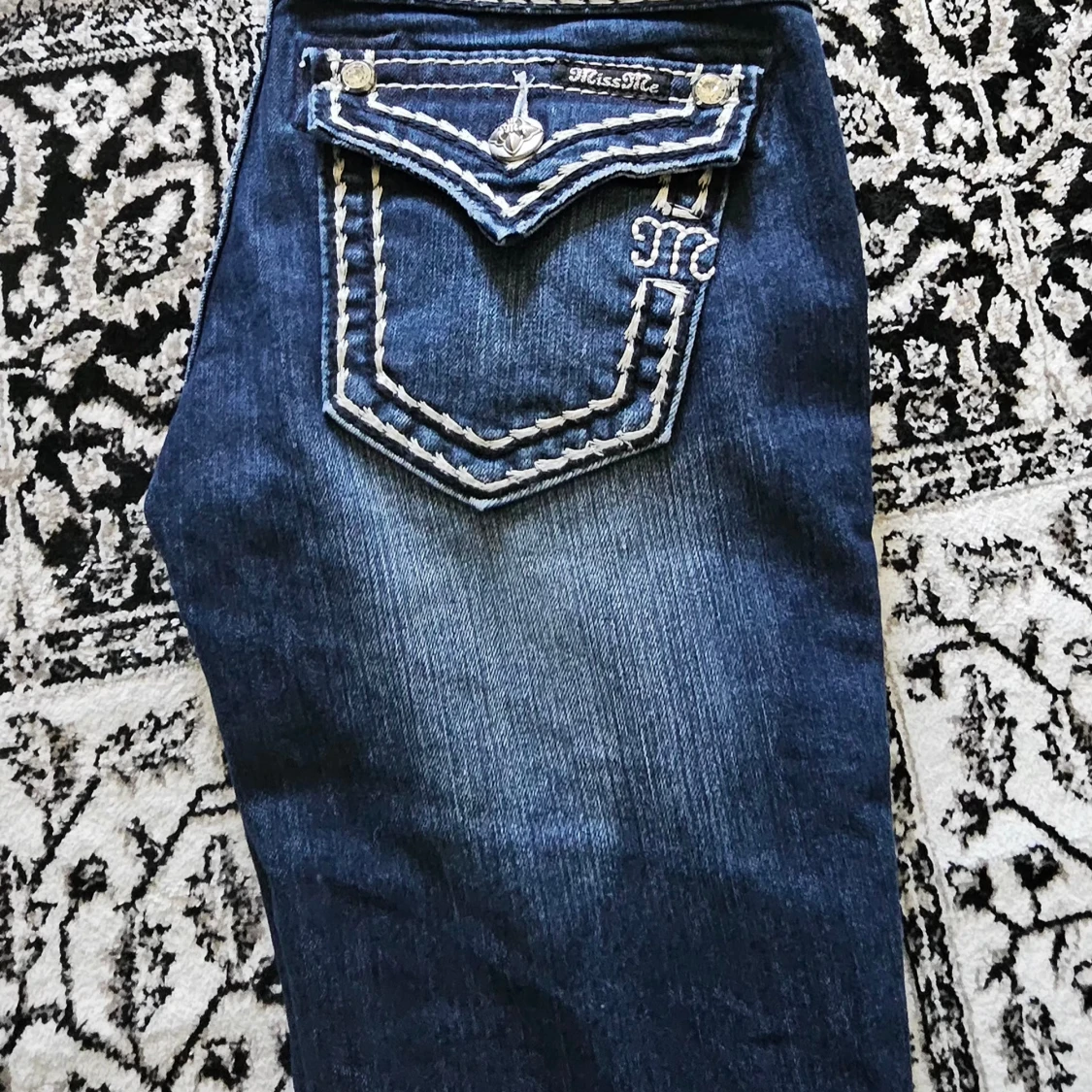 Snygga blå jeans från Miss Me med tydliga vita kontrastsömmar och coola detaljer på bakfickorna. Jeansen har en klassisk femficksmodell och är tillverkade i en mix av bomull, polyester och elastan för en bekväm passform. Perfekta för dig som gillar statement-jeans , super snygga stl 24