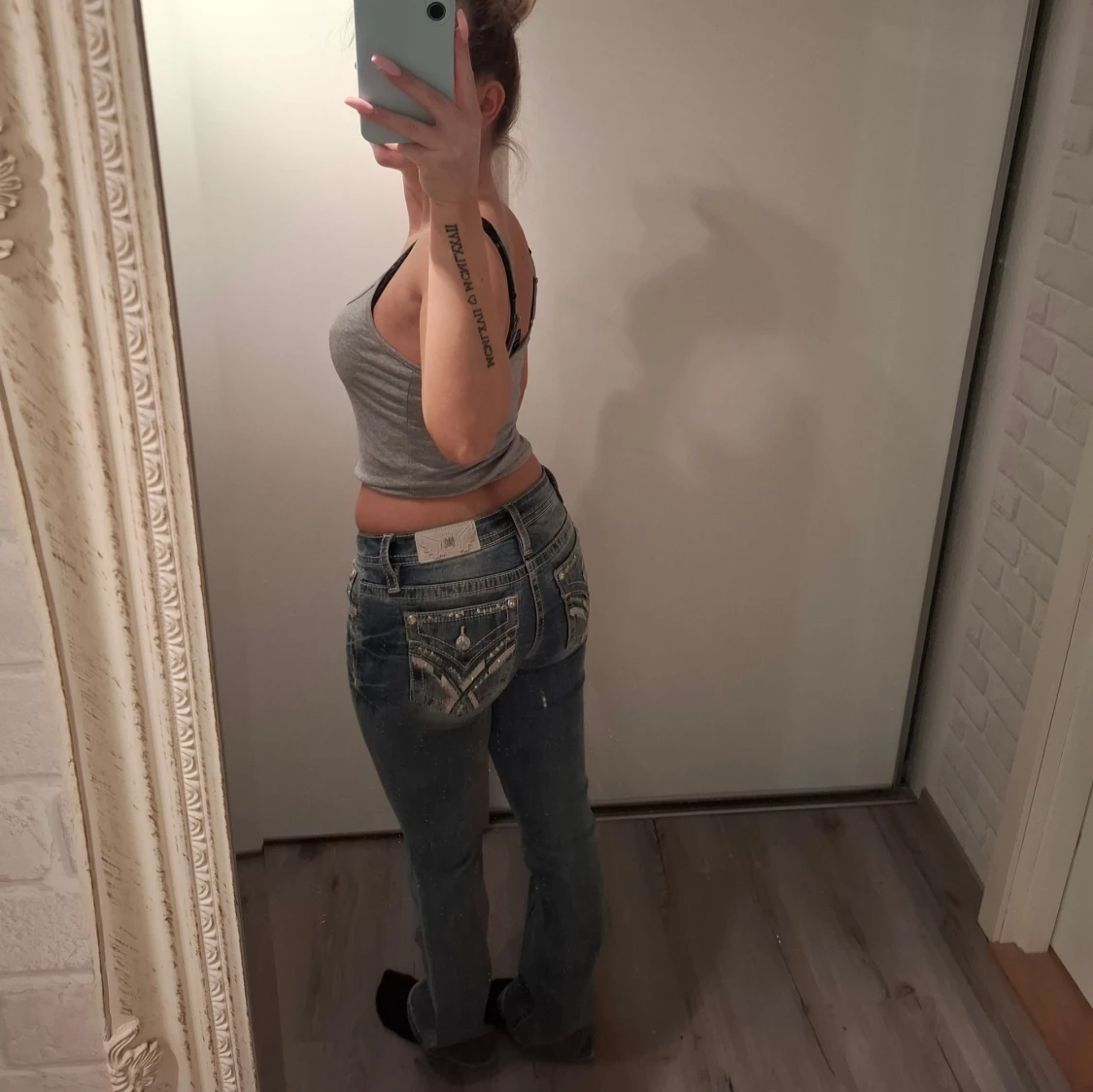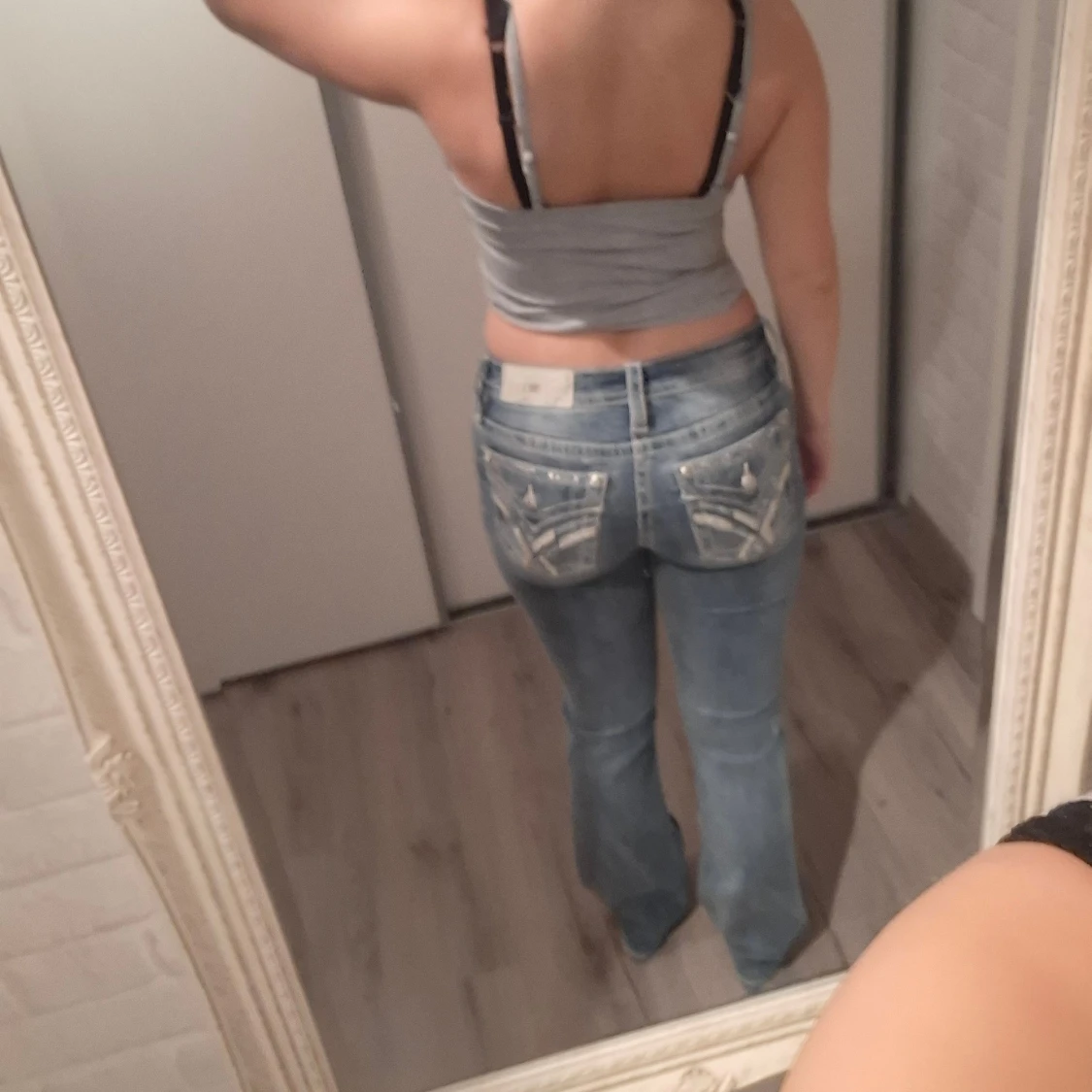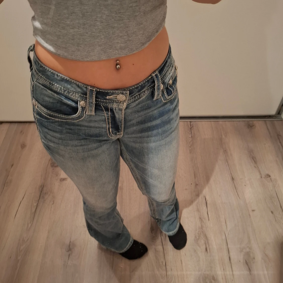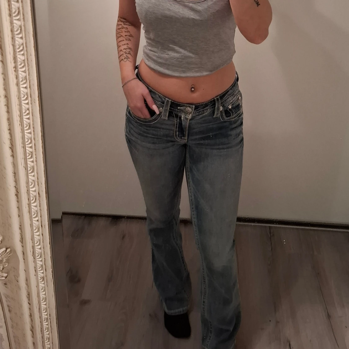Säljer ett par Miss me jeans med snygga slitningar och kontrastsömmar. Bakfickorna har coola broderade detaljer och knappar. Jeansen har låg midja och klassisk femficksdesign. Perfekta för dig som gillar en avslappnad men ändå trendig look.