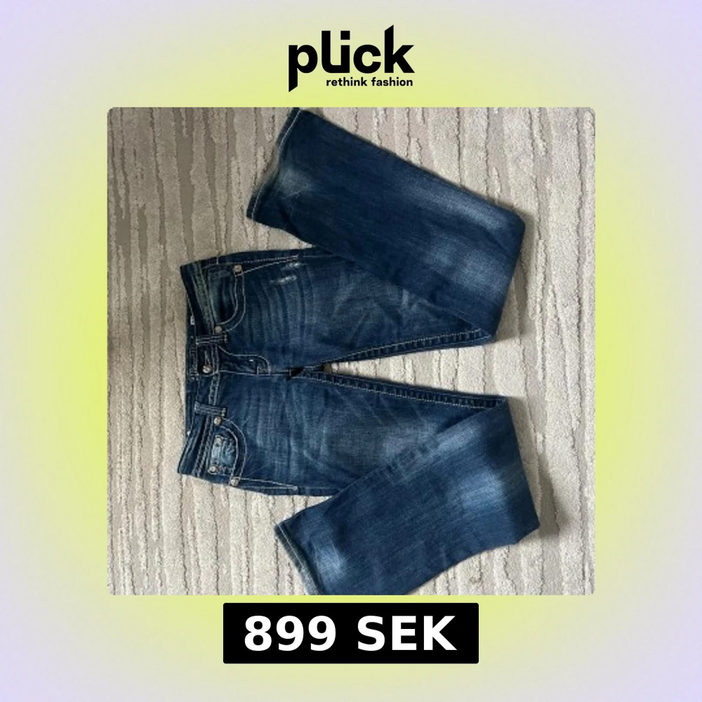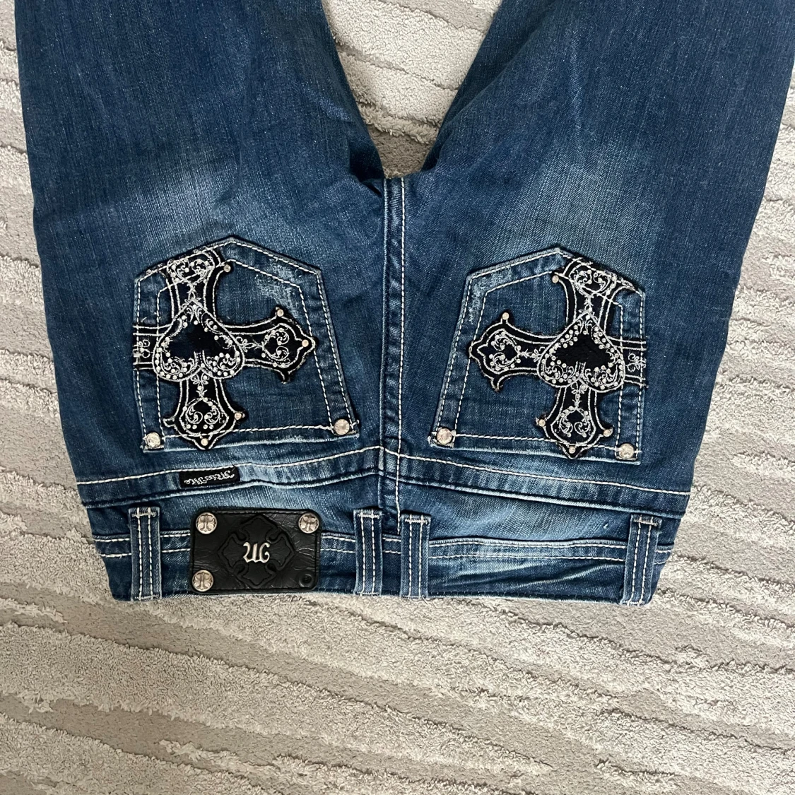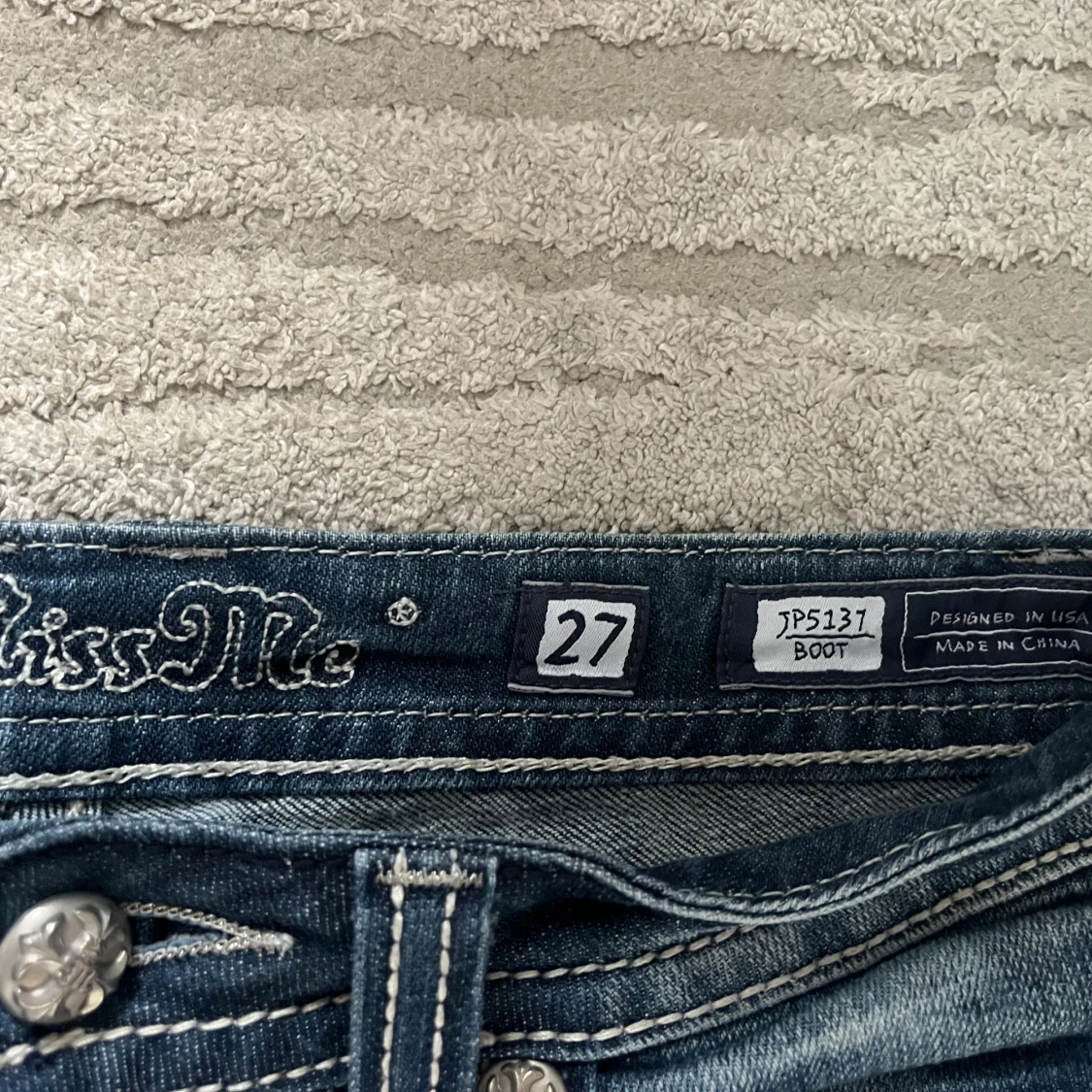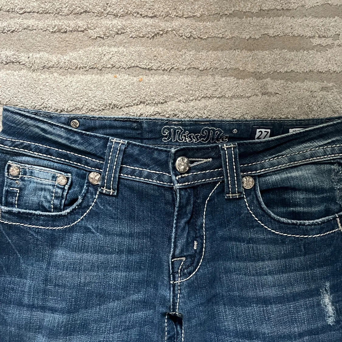 Snygga blå bootcut jeans från Miss Me med kontrastsömmar och broderade bakfickor med korsdetaljer. Jeansen har klassisk femficksdesign, silverfärgade knappar och coola slitningar. Perfekta för dig som vill sticka ut med detaljer och unik stil. Jeansen är i storlek 27 men jag skulle säga att de sitter som en 36. Jeansen är köpta secondhand i london på camden market då ordinarie pris var 1500 kr. Jeansen är superbra i längden och har bara några få slitningar längst ner.