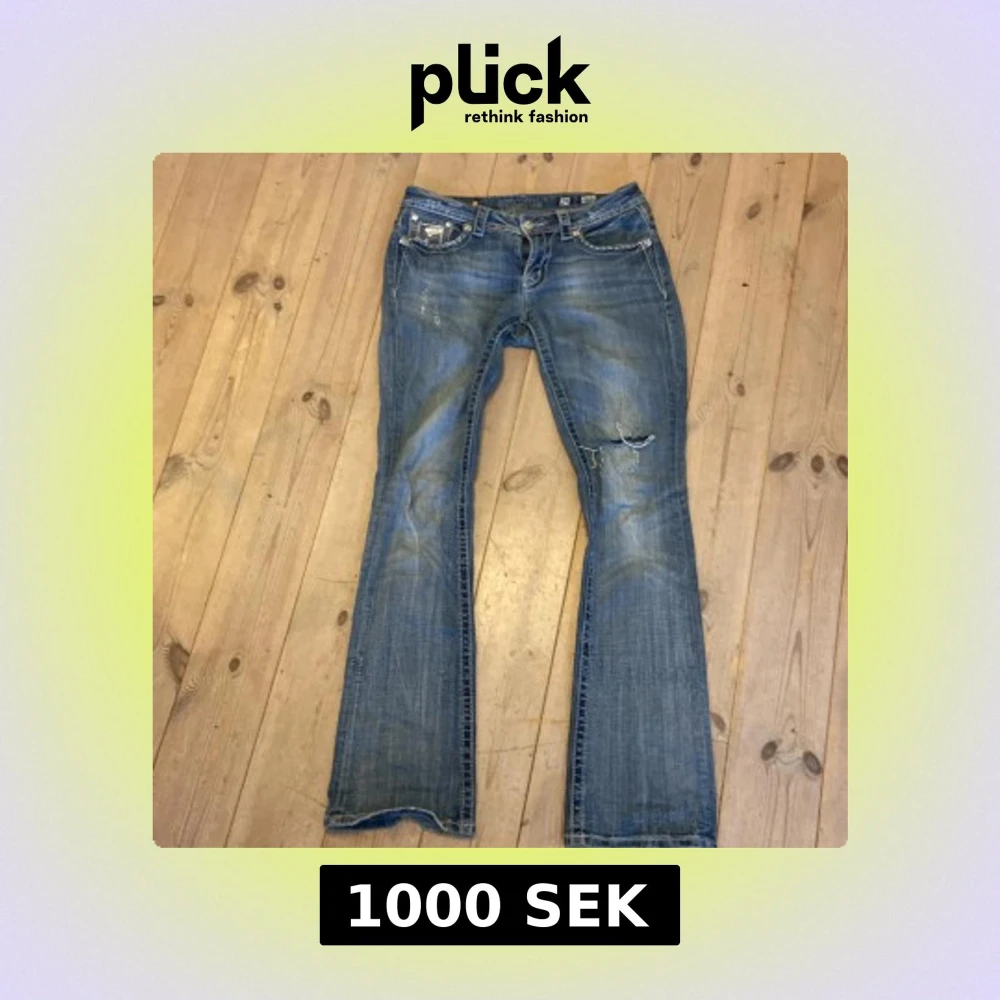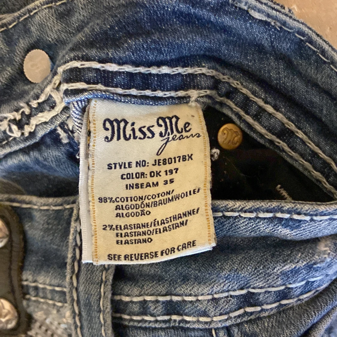 Snygga blå jeans från Miss Me med bootcut-stil och dekorativa detaljer på bakfickorna. Skriv för mer info eller bilder. Pris kan diskuteras.