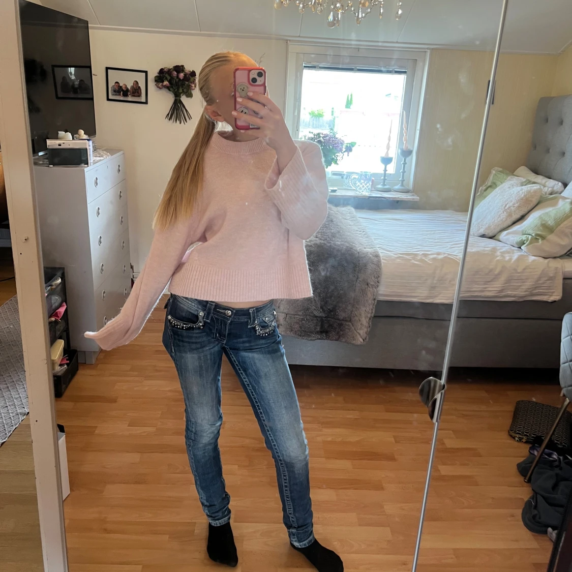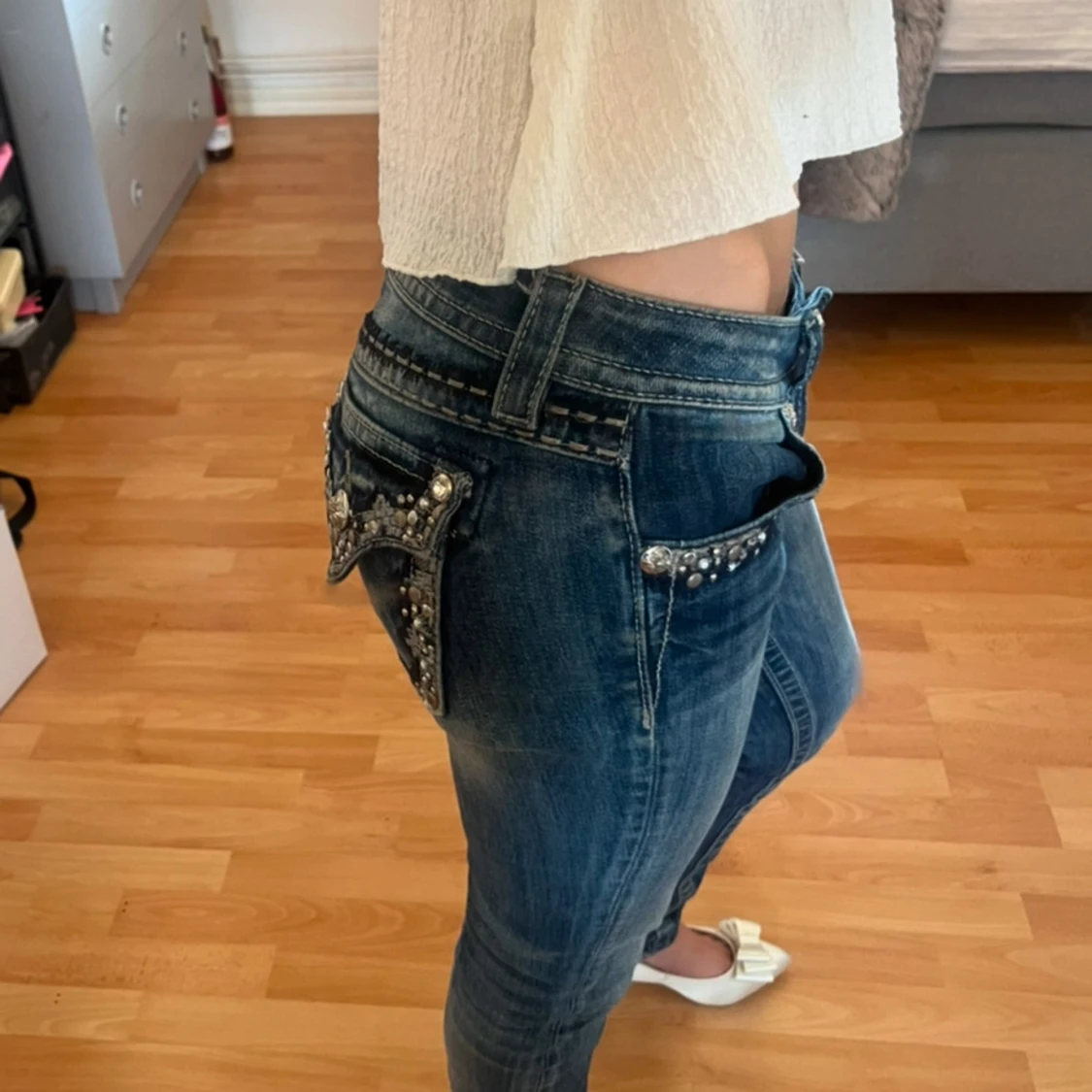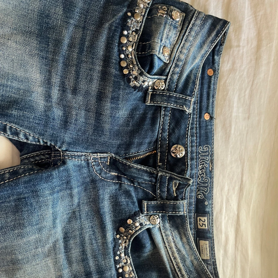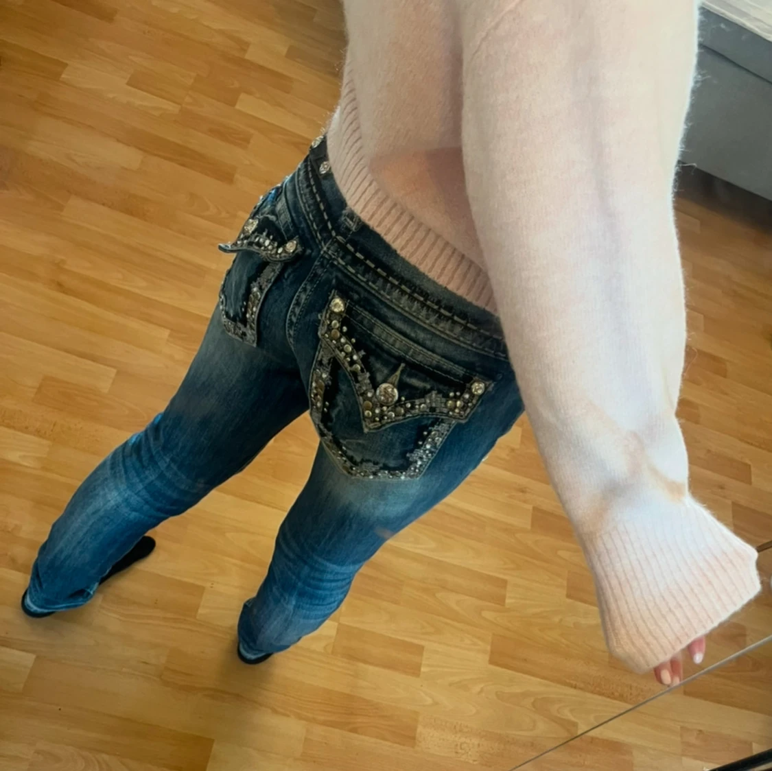Säljer ett par blå, snygga Miss Me jeans med utsmyckning både fram och bak. Säljs pågrund av att dem är förstora, något som inte syns på bilderna. Jeansen är lågmidjade och straightleg/skinny, men kan nog sys om till bootcut om man så skulle vilja! Perfekt för dig som vill ha en trendig och unik look💕🤗