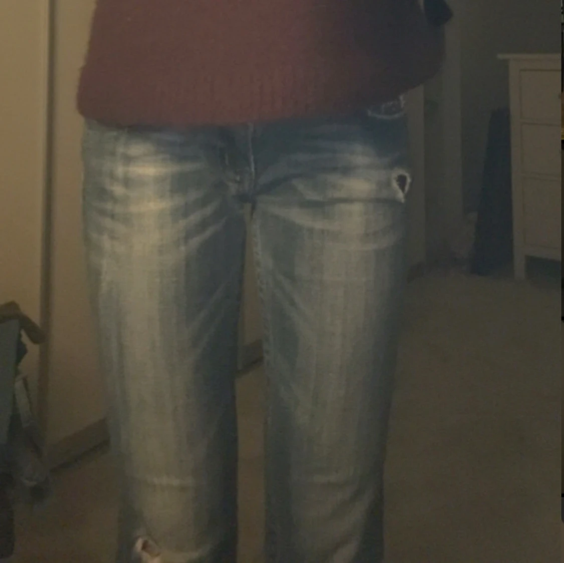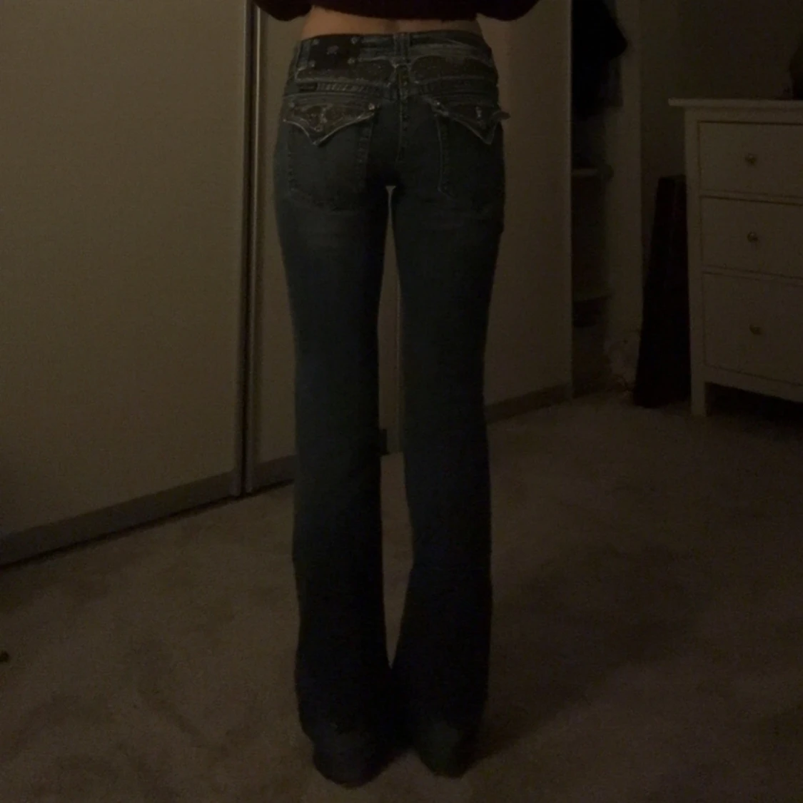 Skitsnygga bootcut jeans från Miss Me med slitningar och ljusa tvättade partier. Jeansen har låg midja, dekorativa bakfickor med broderier och klassisk femficksdesign. Perfekta för dig som gillar en avslappnad och trendig look.