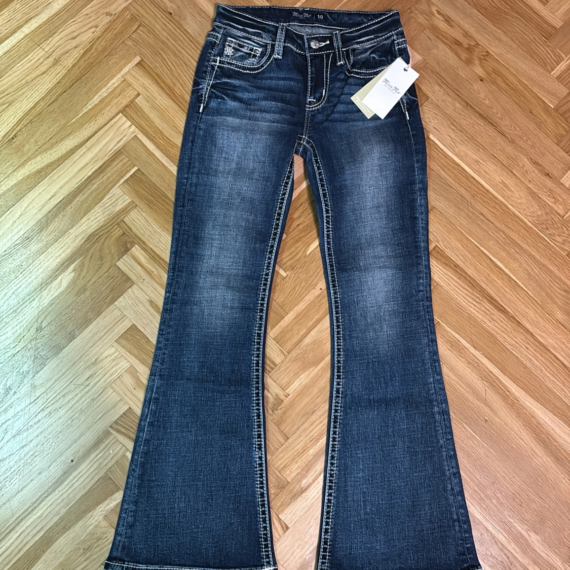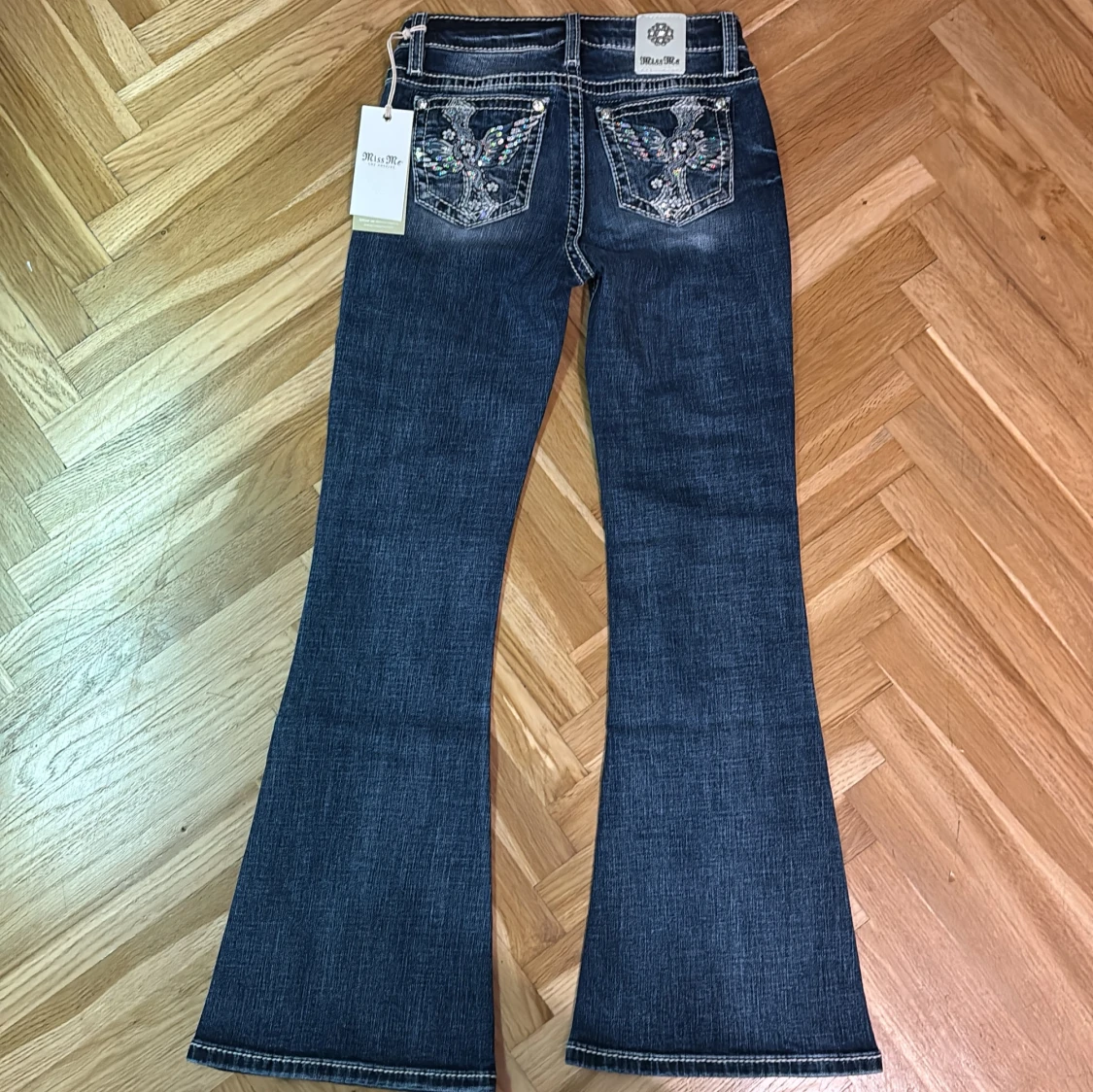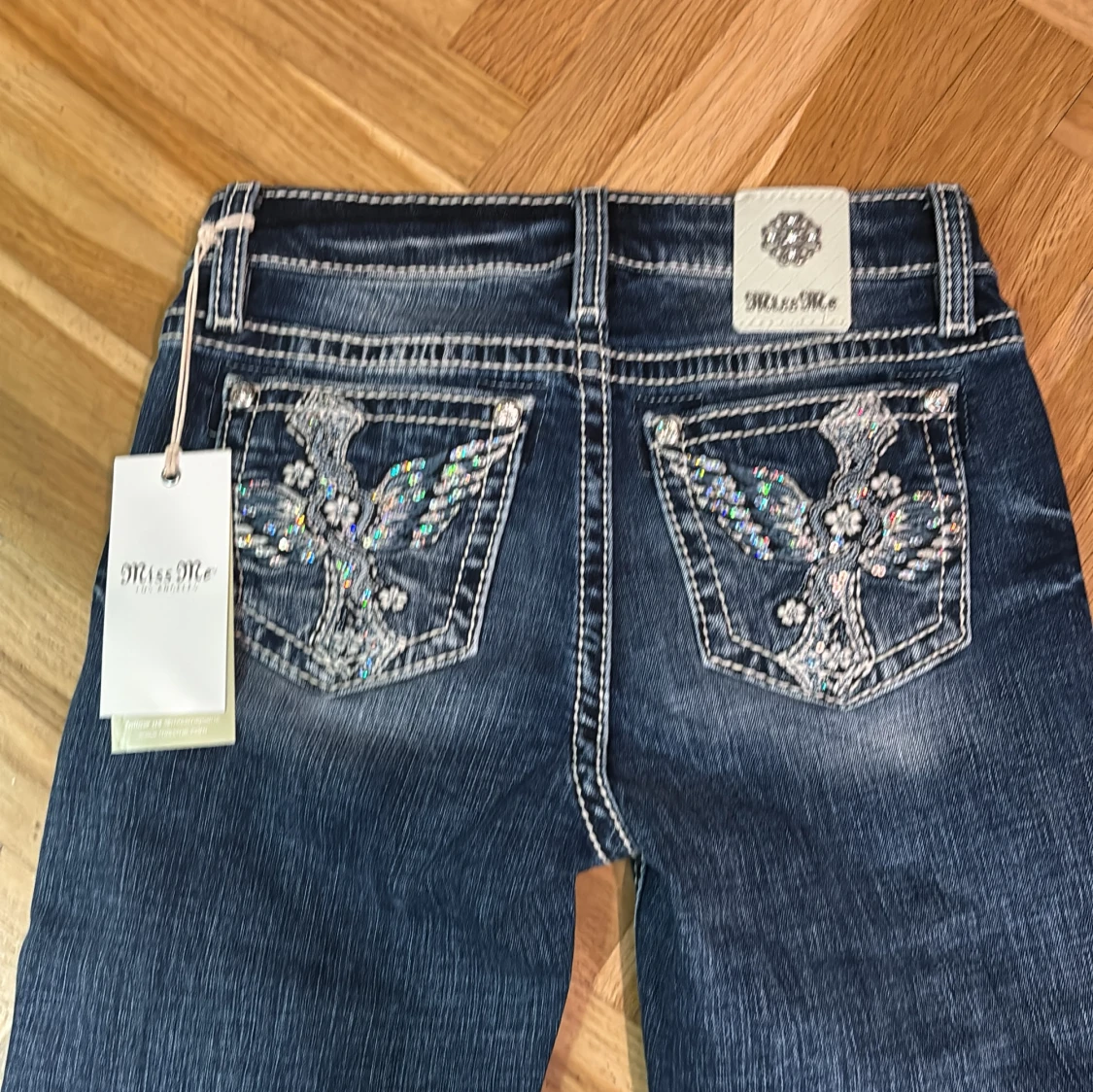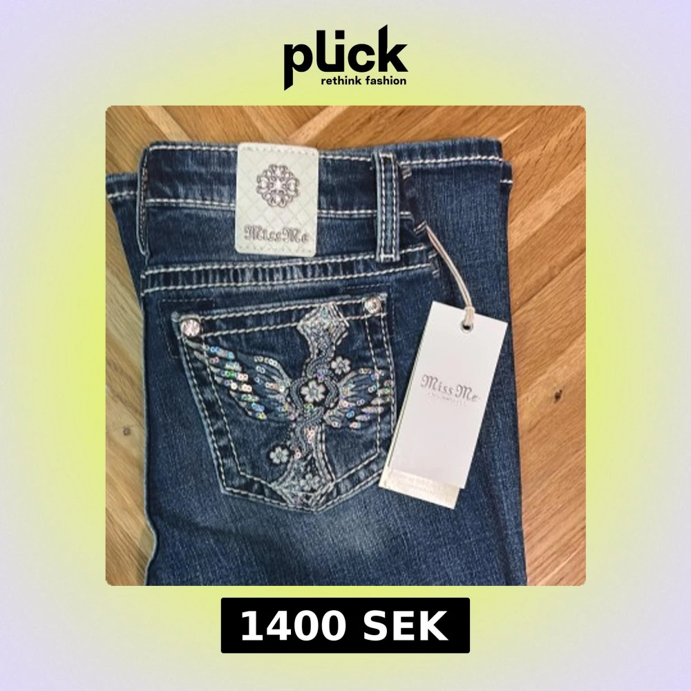 Säljer helt nya och oanvända flared miss me jeans. Storlek 10 i barn storlek på miss me hemsidan, vet inte exakt men den motsvarar ungefär S. Midja är ca 63 cm och innerbensmått är ca 73 cm. Priset kan diskuteras!💕