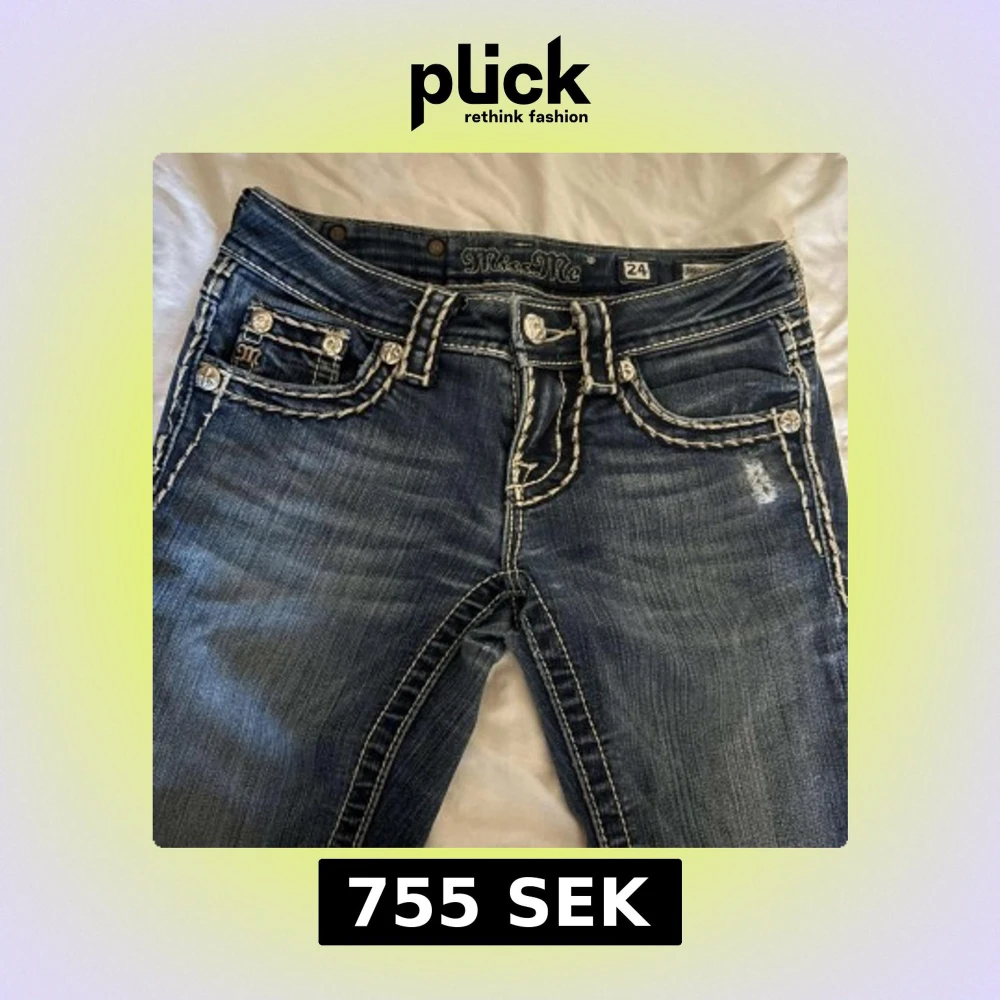 Snygga blå Miss Me jeans med tydliga vita kontrastsömmar och dekorativa fickor med broderade detaljer och blanka knappar. Låg midja och bootcut-ben. Köpt för ganska mycket så säljer billigare och pgrund av att dom har fått ett litet hål mellan benen som knappt syns.