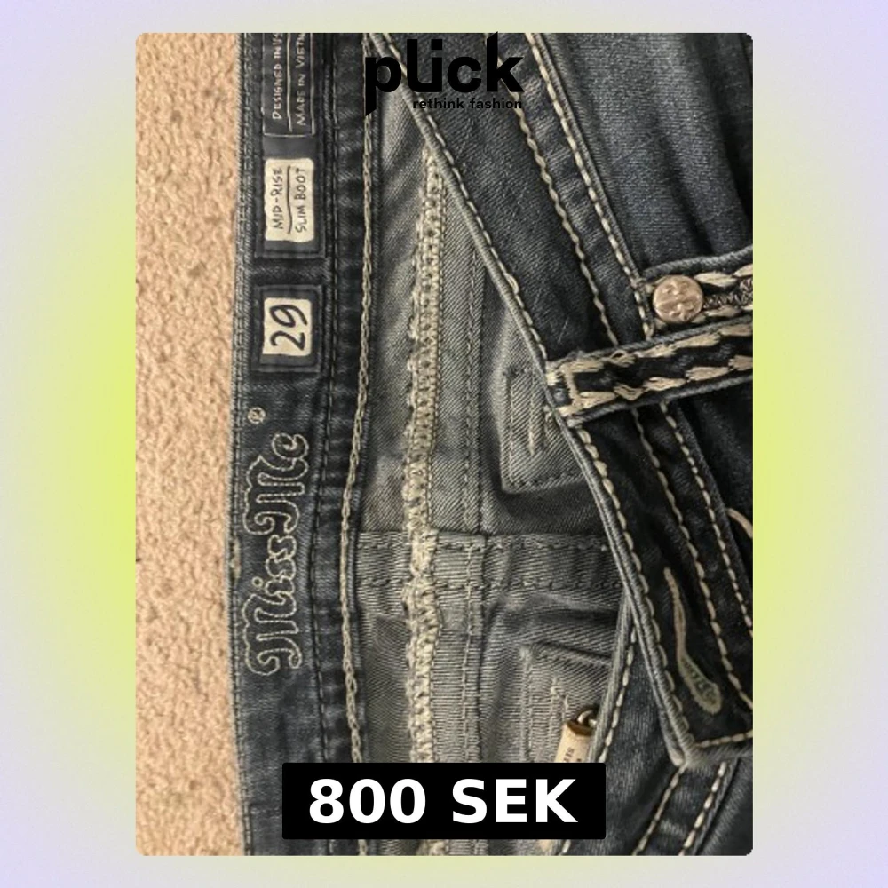 Snygga blå jeans från Miss Me i storlek 29 med midwaist och bootcut passform. Jeansen har kontrasterande vita sömmar, dekorativa fickor bak med broderade detaljer och slitningar framtill. Materialet är klassisk jeans med stretch för extra komfort. Midjemått 42