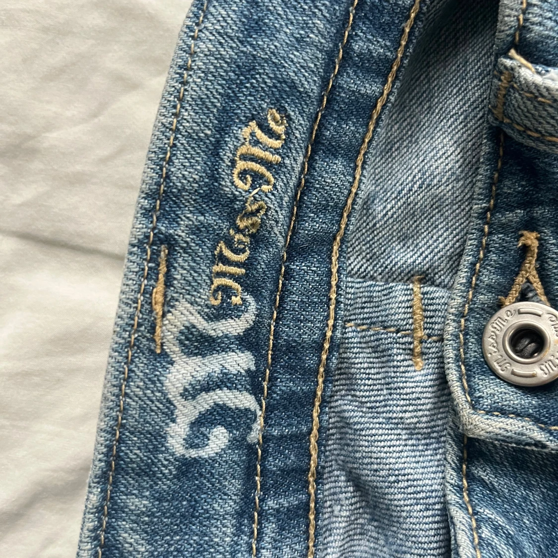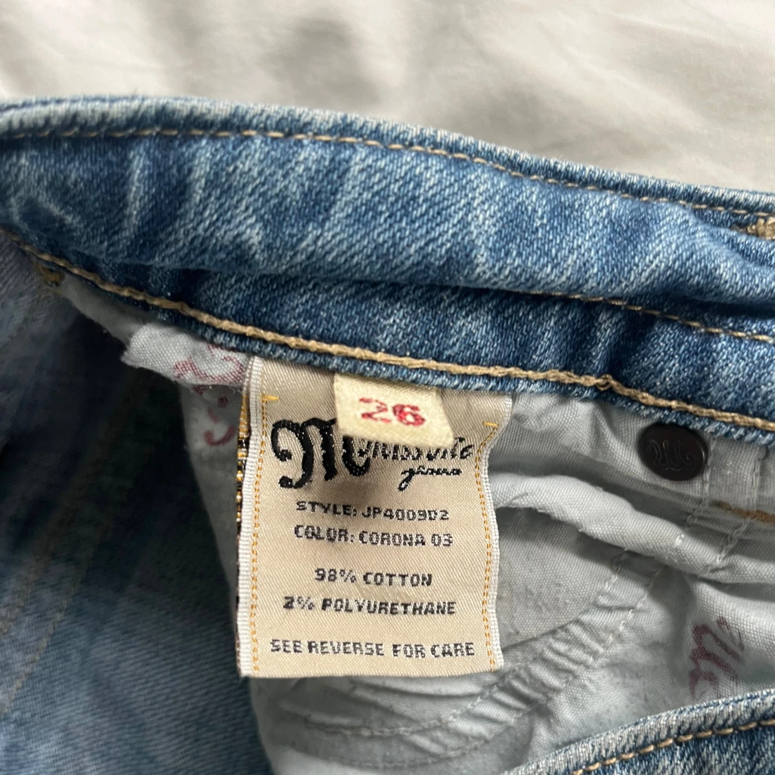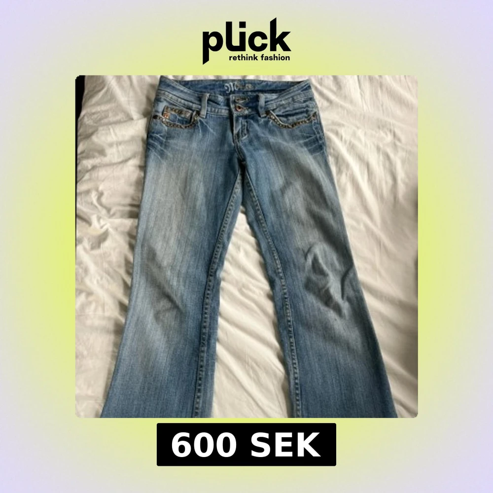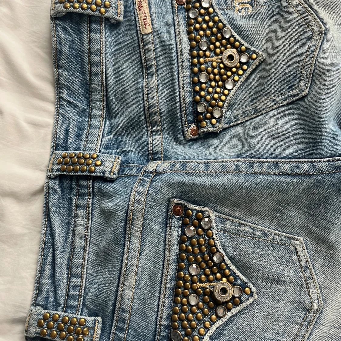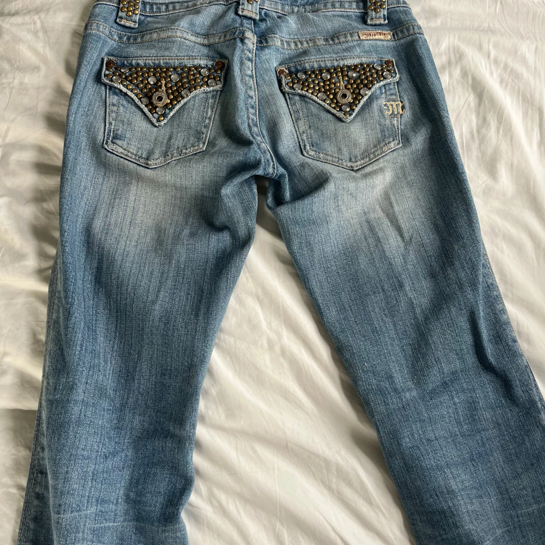 Bootcut Miss Me jeans med bronsfärgade nitar av äldre modell. Jeansen är i storlek 26 (amerikans storlek) vilket motsvarar ungefär XS/S.