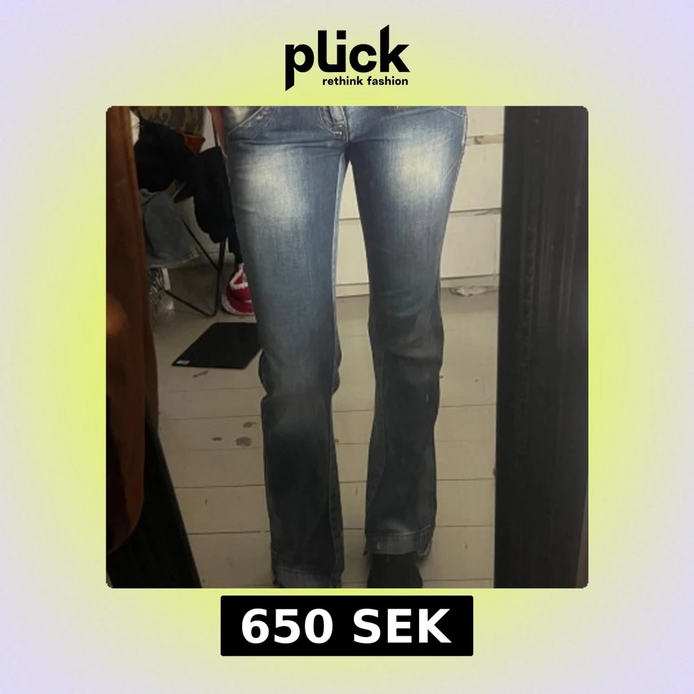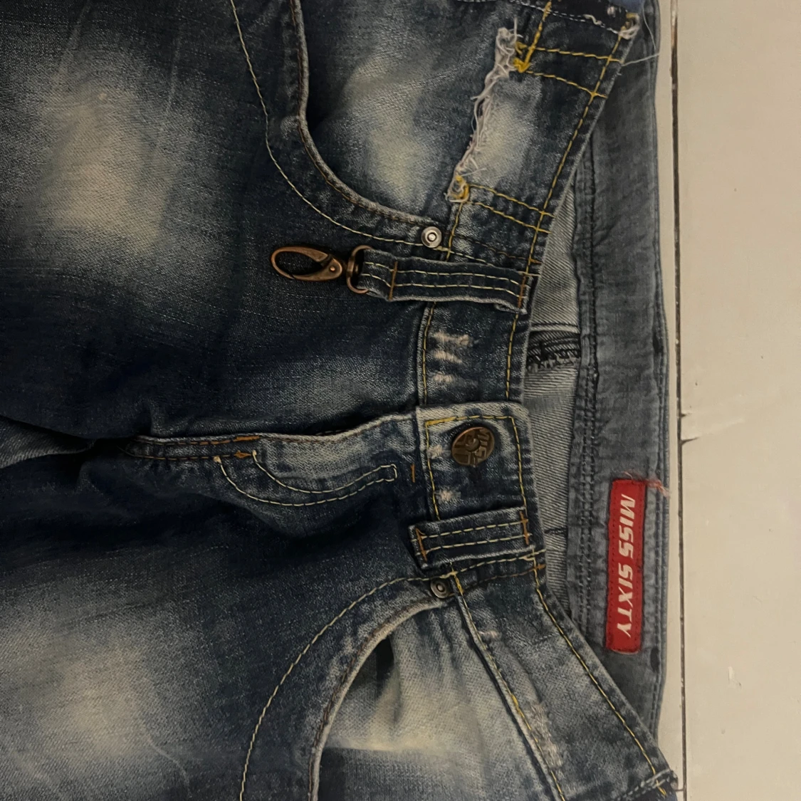 Snygga blå bootcut jeans från Miss Sixty med slitna detaljer och ljusa partier. Klassisk femficksmodell med coola sömmar, metallknapp och logga bak. Jeansen har låg midja och är tillverkade i mjukt denimtyg med lite stretch för skön passform.