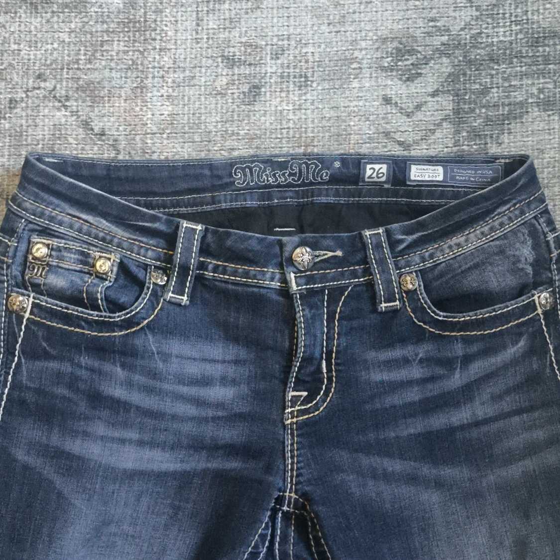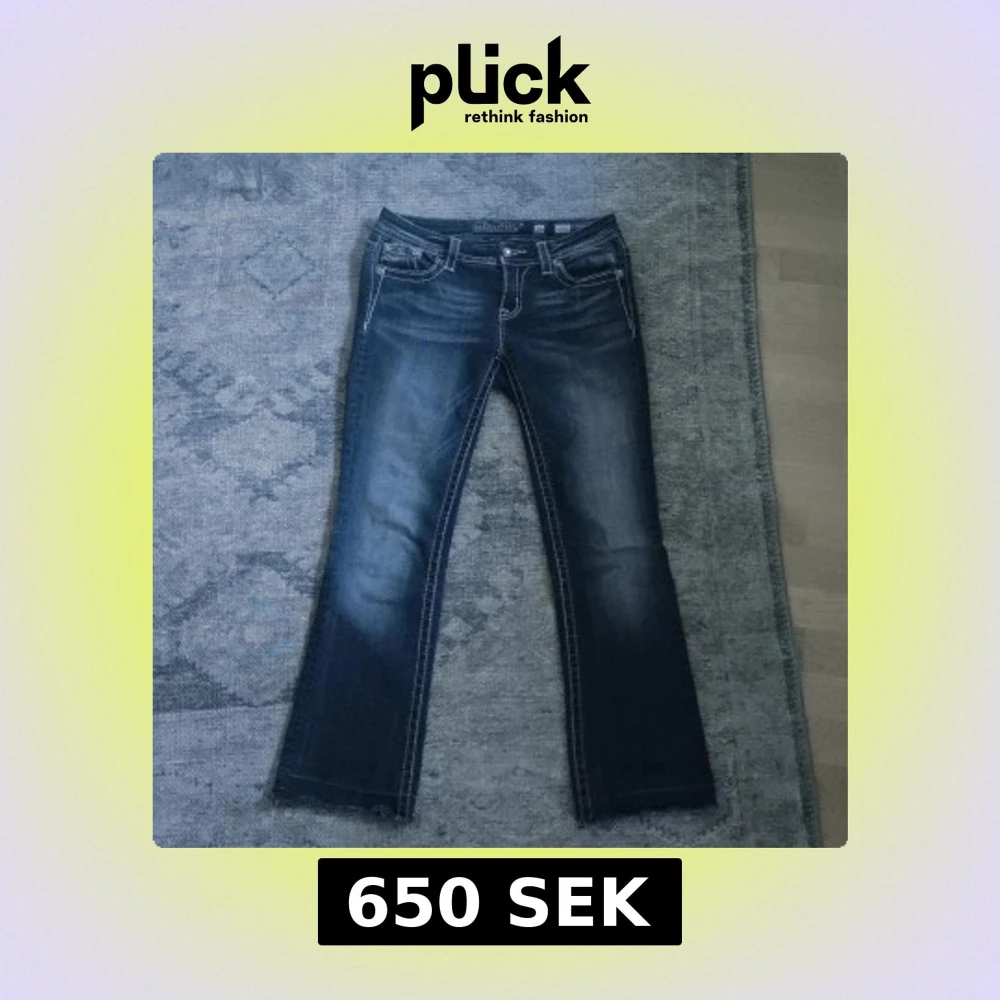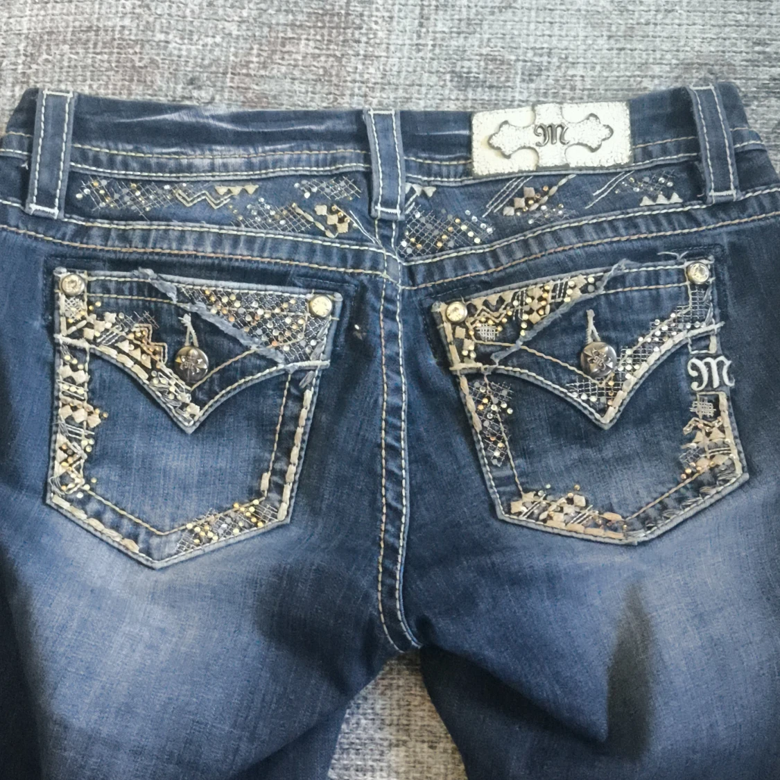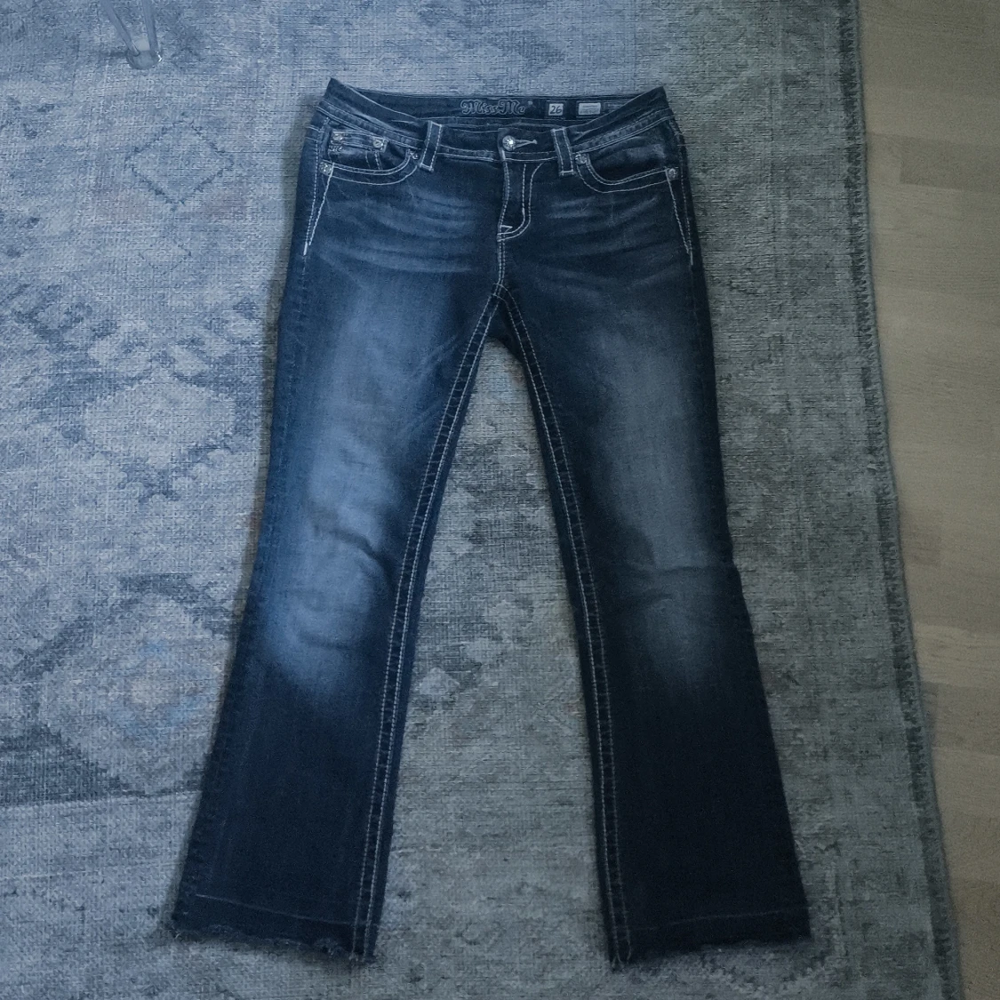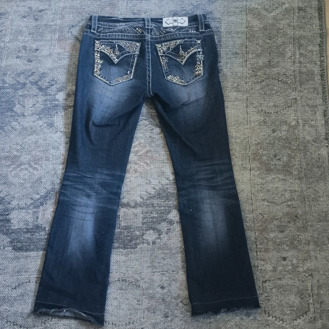 Snygga blå lågmidjade jeans från Miss Me i bootcut-modell med broderade och glittriga detaljer på bakfickorna. Tydliga kontrastsömmar, byxorna är lite slitna och avklippta där nere och jeansen är i storlek w26.