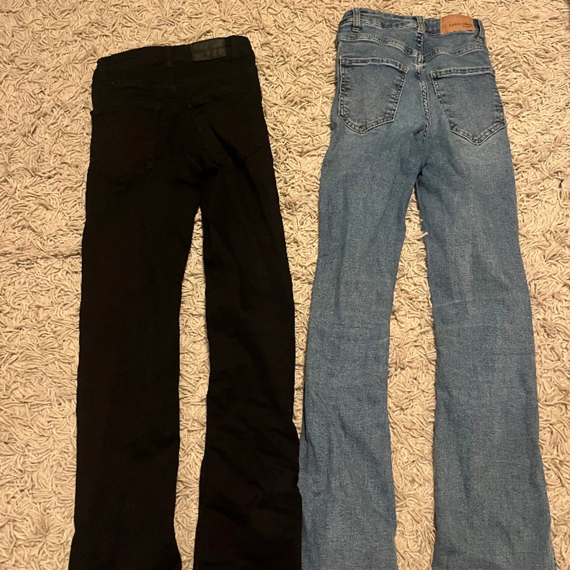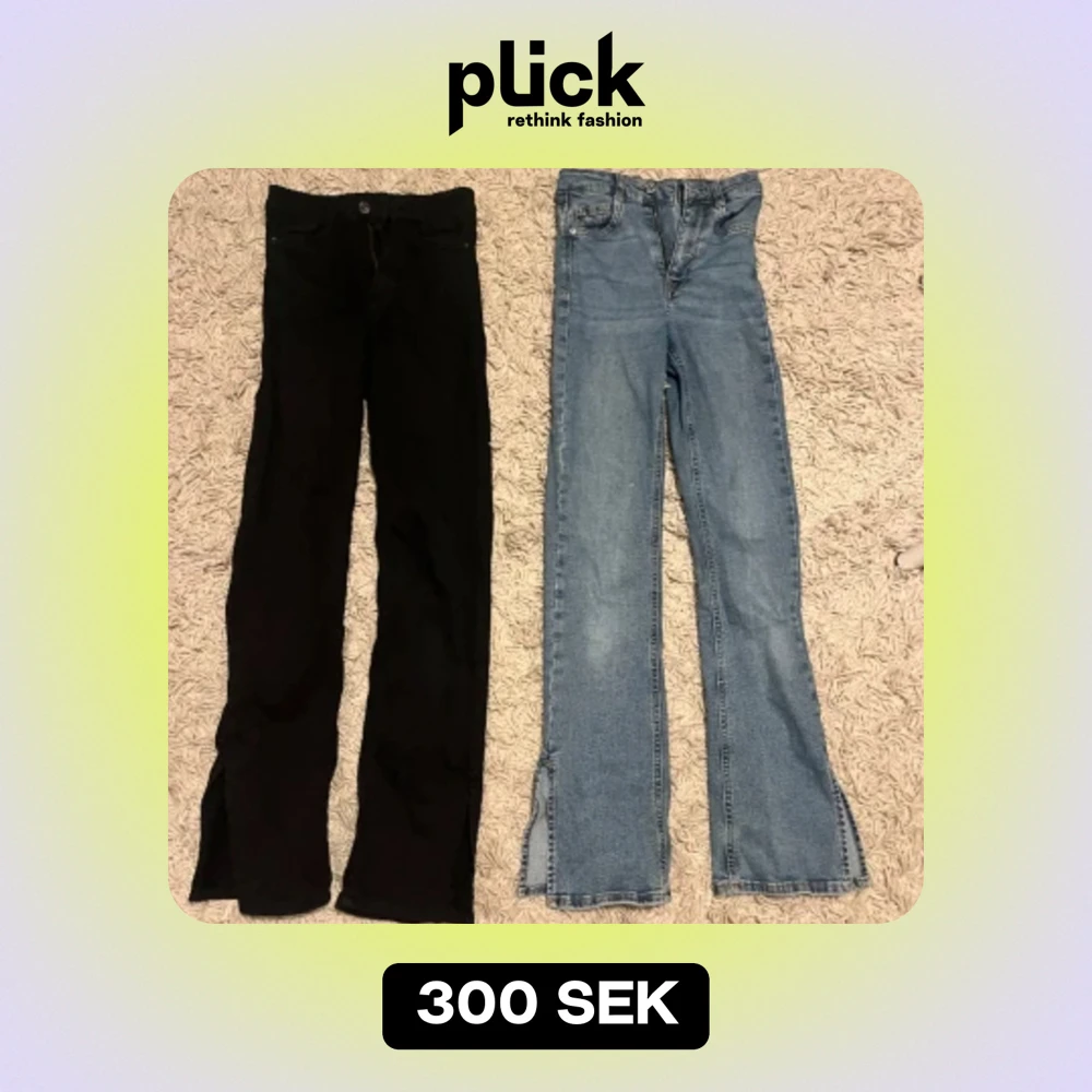 Säljer dessa två jätte fina jeans från gina tricot då de tyvärr är för små för mig, ett par svarta o blåa💞Low/mid waist, utsvängda längst ner med en slit💓 startpris 300 för båda jeansen tillsammans💞