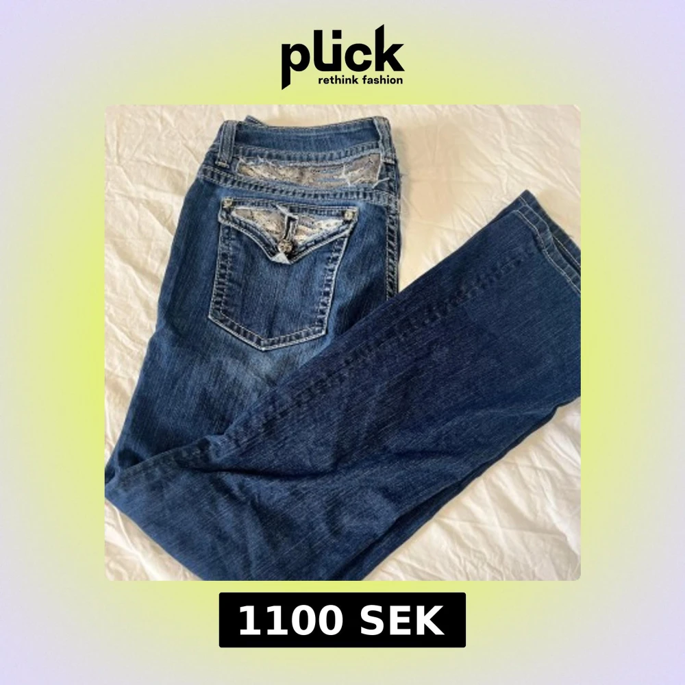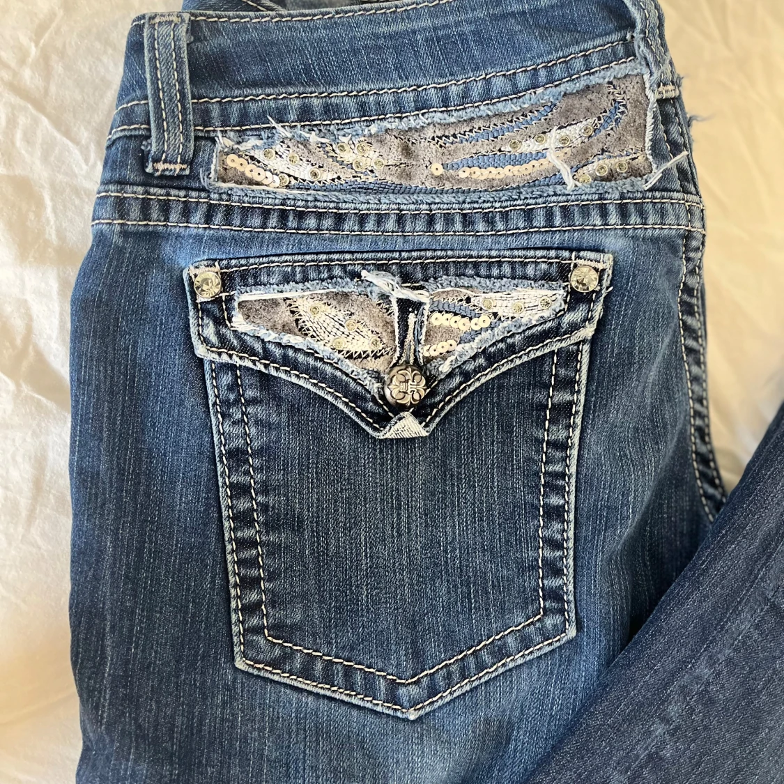 Snygga blå jeans från Miss Me med unika paljettdetaljer och spets på bakfickorna. Jeansen har kontrastsömmar, dekorativa knappar och klassisk femficksdesign. Perfekta för dig som vill sticka ut med lite extra bling i vardagen.