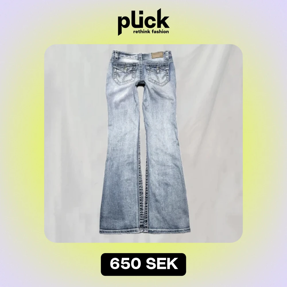 Midja: 73 innerben:78,5 Jeans med detaljerade bakfickor. Sitter lite bootcut. Hittar ingen storlek men passar kring XS (använd mått). Något ytterst smått nötta men överlag mycket fint skick!🤍