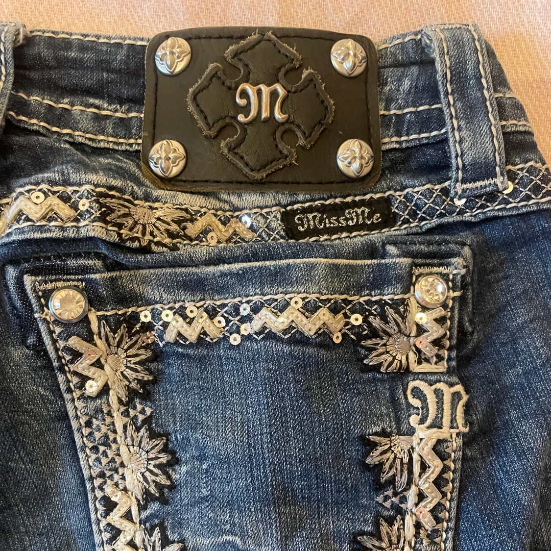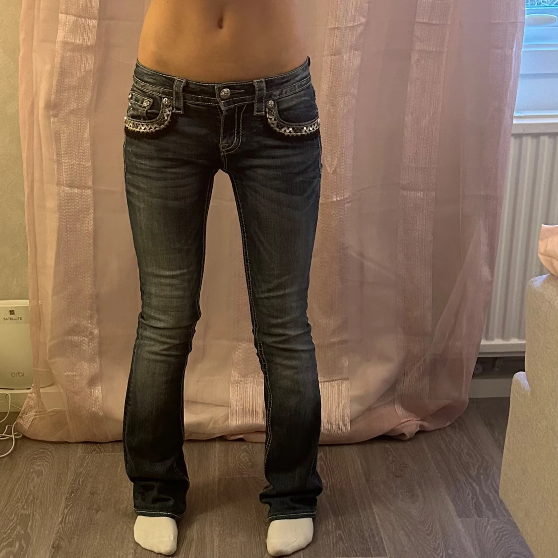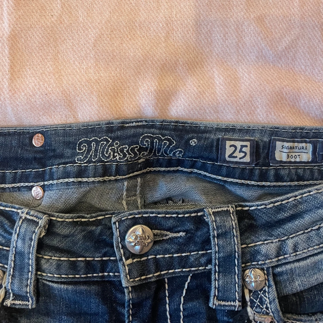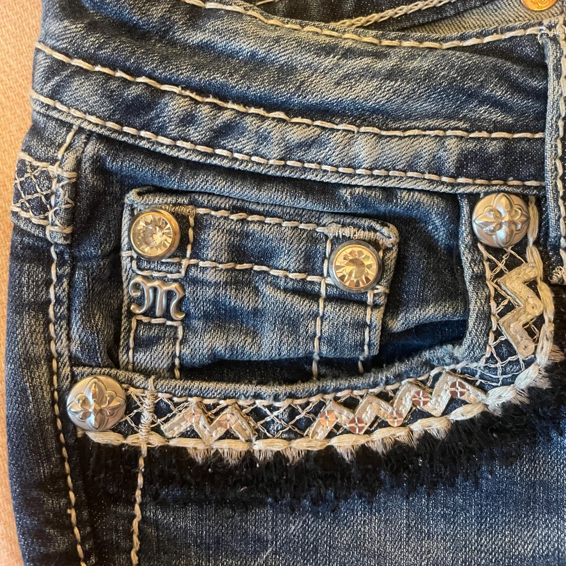 Ett par mörk blå Miss Me jeans som är i modellen bootcut. De har coola broderade designer både på fickorna där fram, och på fickorna där bak. Mycket bra skick! De är i storlek 25 och passar perfekt på mig som är 166! Skriv för fler bilder/ frågor eller mått!💖