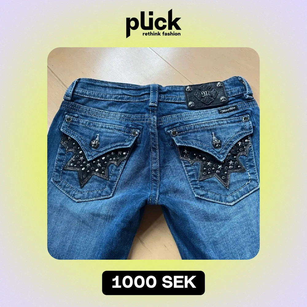 Snygga blå jeans från Miss Me med unika stjärndetaljer och nitar på bakfickorna. De har en låg midja är flare ❣️ Bilderna är lånade från förra ägaren så hör av dig vid frågor eller egna bilder!!❣️innerbenslängd: 88 midjemått: 82,5 (w27)