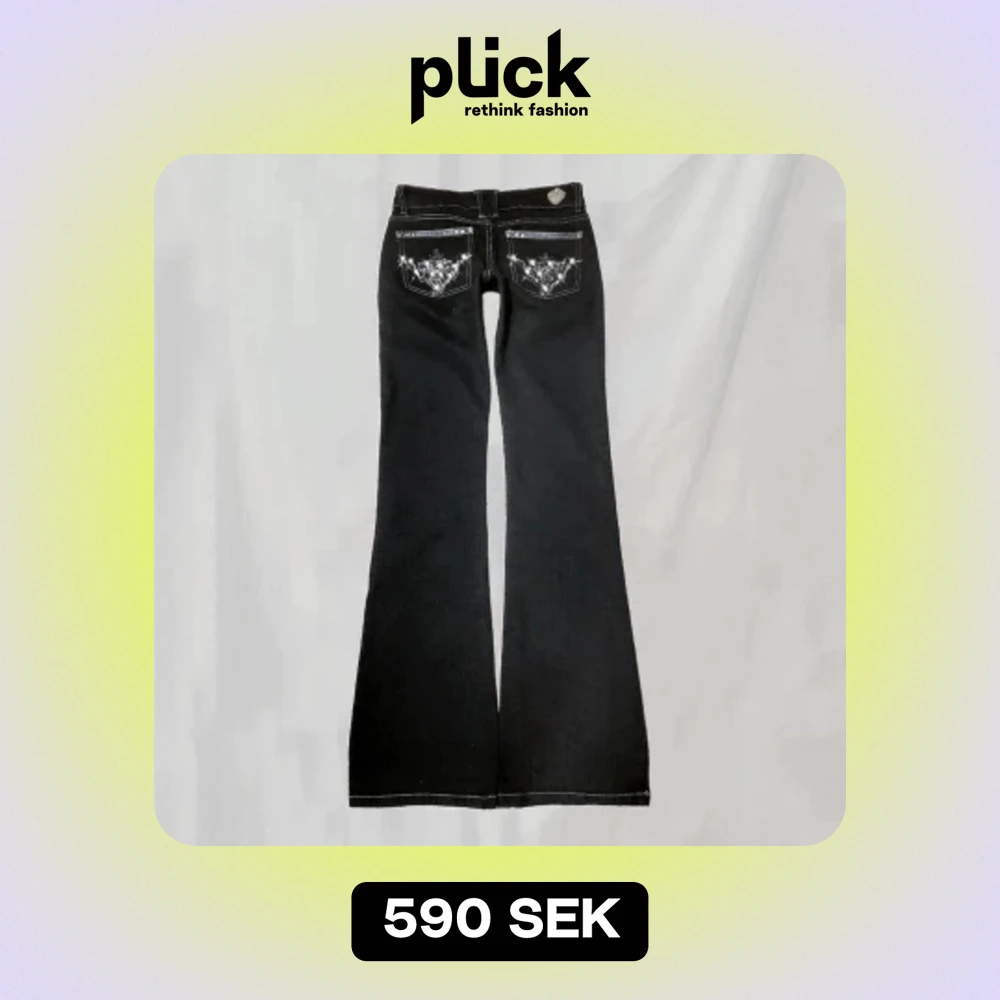 Midja:70 innerben:85 Svarta bootcut jeans med rhinstones. Uppskattar passa en XS. Skulle säga att de sitter low/midwaist. Storlek "8", uppskattar passa en XS. Endast några få stenar saknas, utöver det i nyskick!!🤍