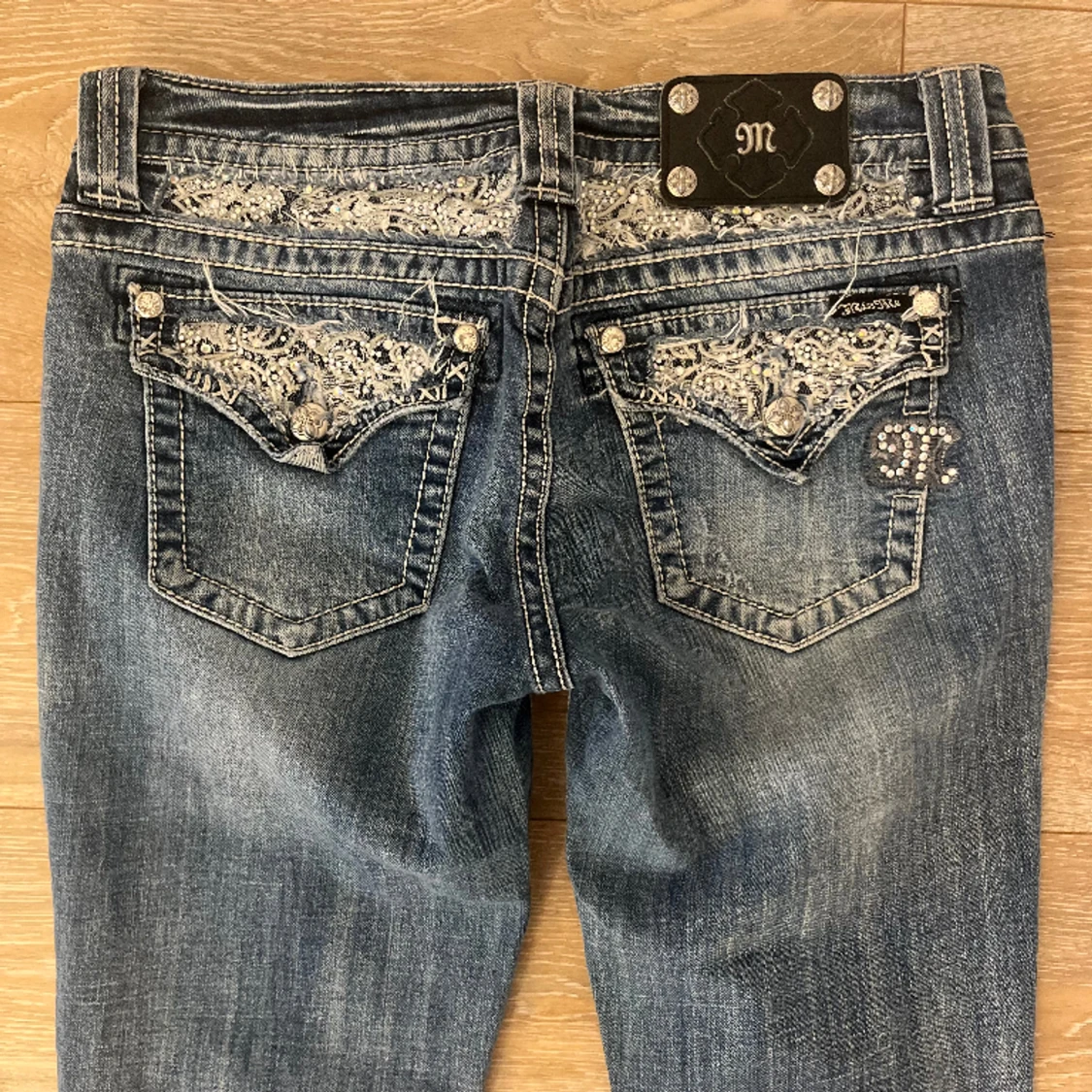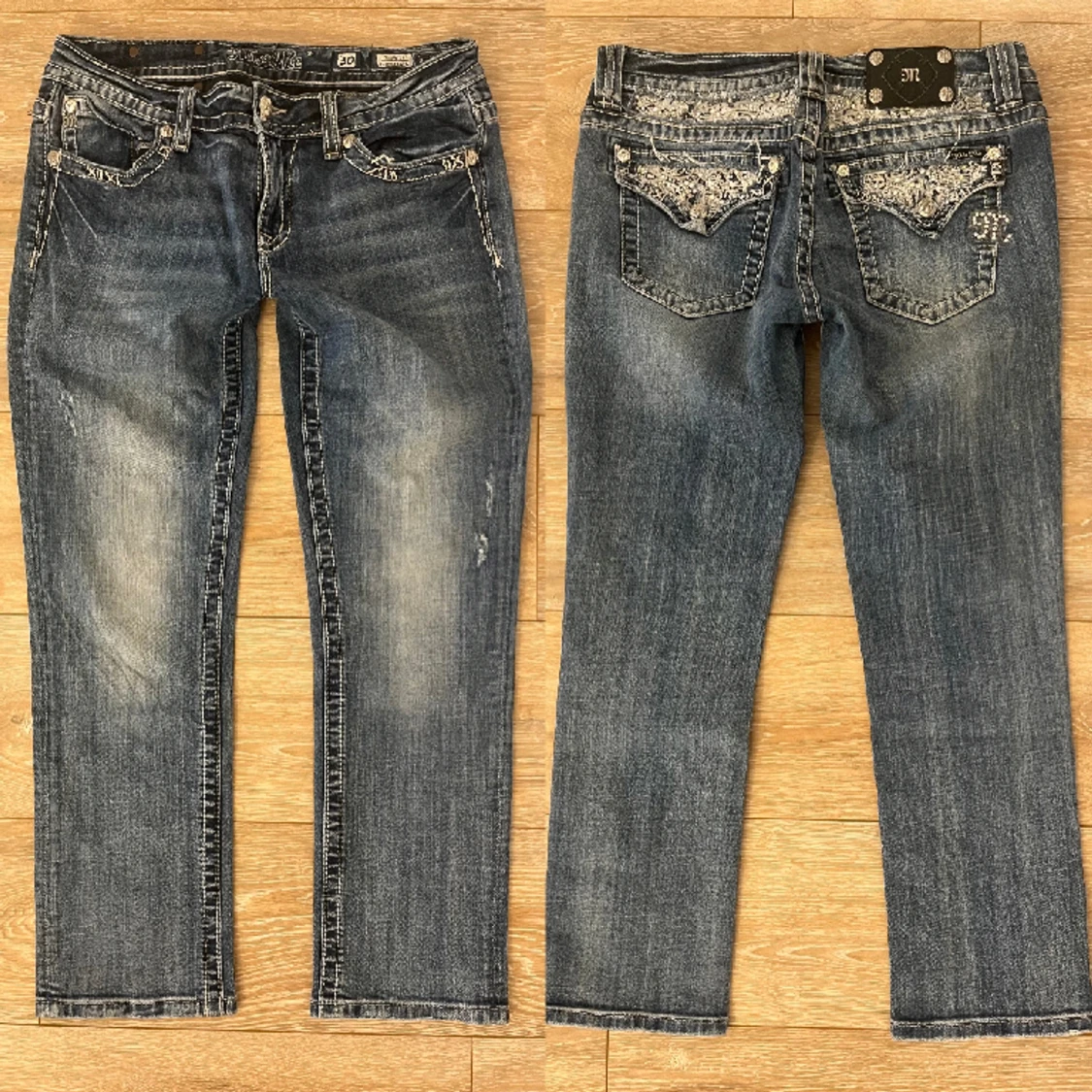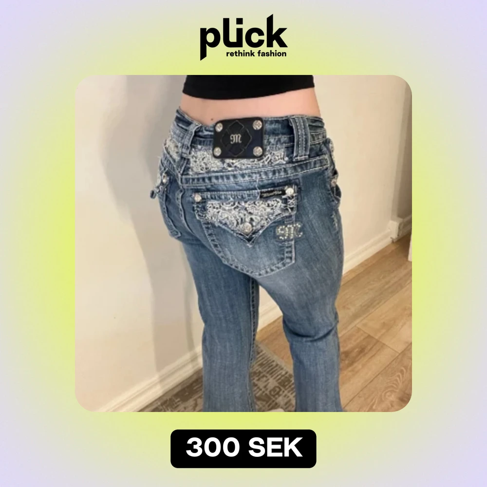 Lågmidjade miss me jeans i stilen cuffed capri, midjemåttet tvärs över är är 40cm och Innerbenslängden är 67cm❤️