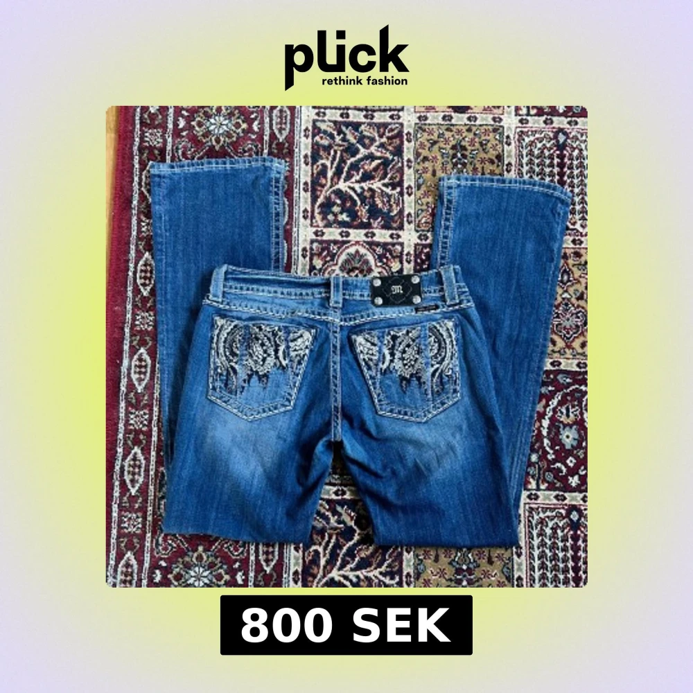 Jättesnygga bootcutjeans från Miss me med coola detaljer på bakfickorna och diamantdetaljer.🥰 Midjemått: 42,5cm rakt över Innerbenslängd: 83cm