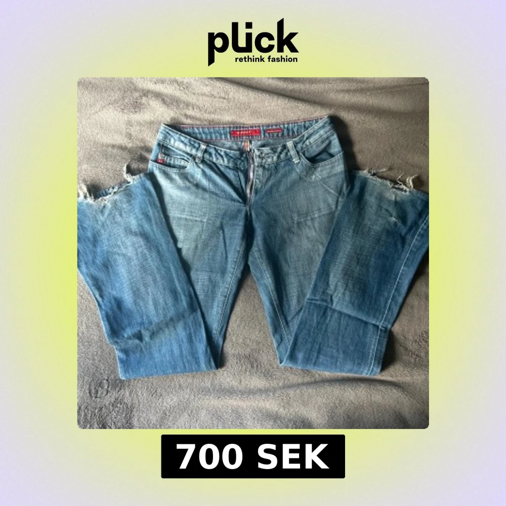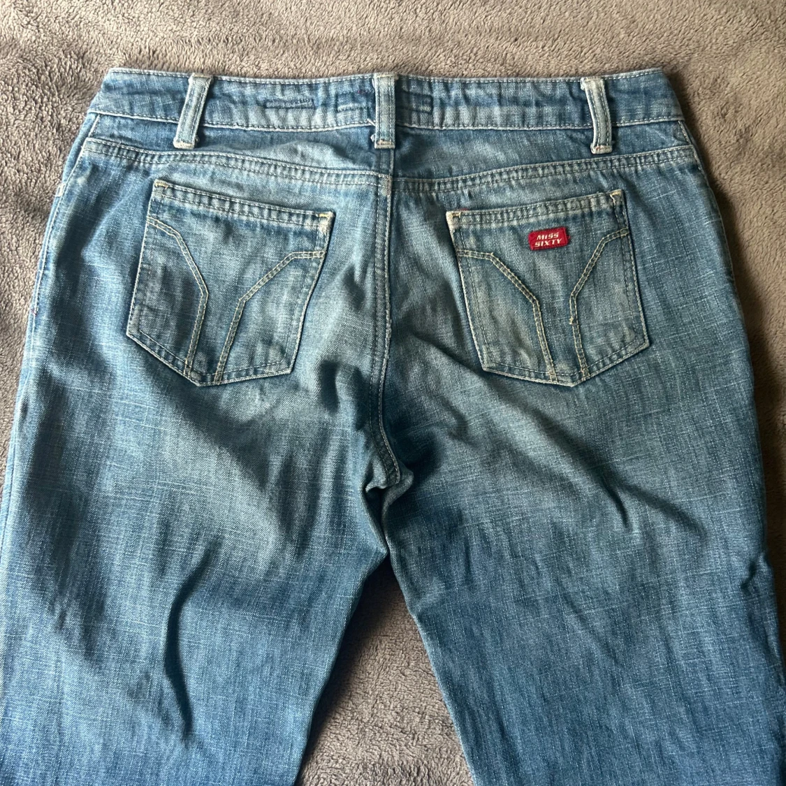 Supersnygga lågmidjade utsvängda jeans från miss sixty med dragkedja. Bra skick förutom lite slitna längst ned. Skulle säga S/M. Midjemått:39 cm Innerbenslängd: 81 cm