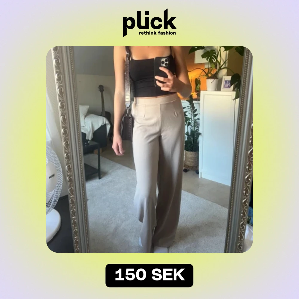 Raka mjuka ”kostymbyxor”, väldigt sköna och stretchiga med resår i midjan. Sparsamt använda. De har små noppror på två ställen och lite lite missfärgning som inte syns på håll. (Se bilder)