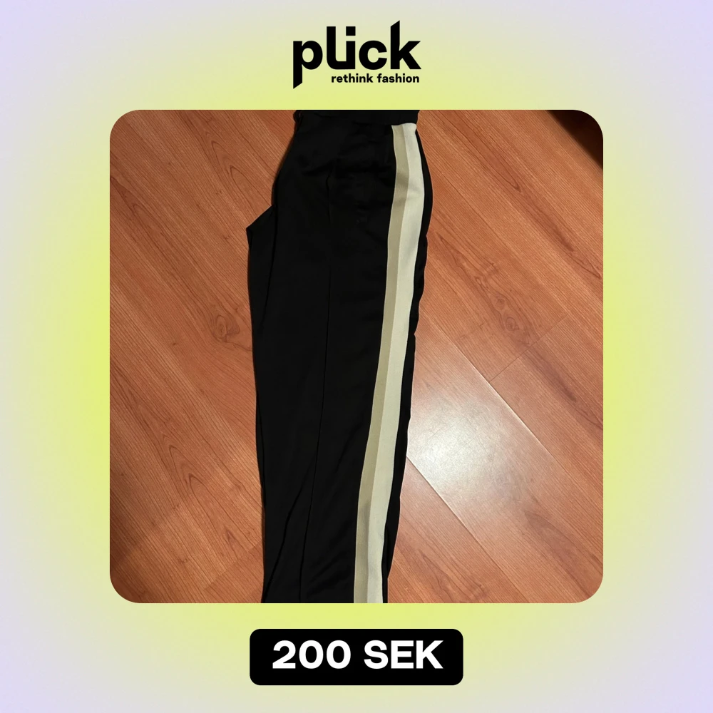 Säljer ett par svarta byxor från Bershka i storlek M. De har ränder längs sidorna och en bekväm elastisk midja med snörning. Perfekta för en avslappnad stil eller träning. Passar bra till både vardag och sportiga aktiviteter. Hör av er vid frågor eller funderingar!