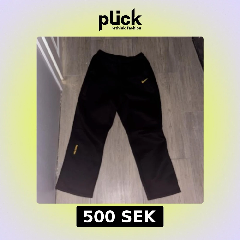 Svarta mjukisbyxor från Nike NOCTA med gul Swoosh och NOCTA-logga på benet. Byxorna har snörning i midjan, sidofickor och tryckta detaljer som 'GL' och 'AWR' i gult på benen. Skön passform och stilren look, perfekt för streetwear.