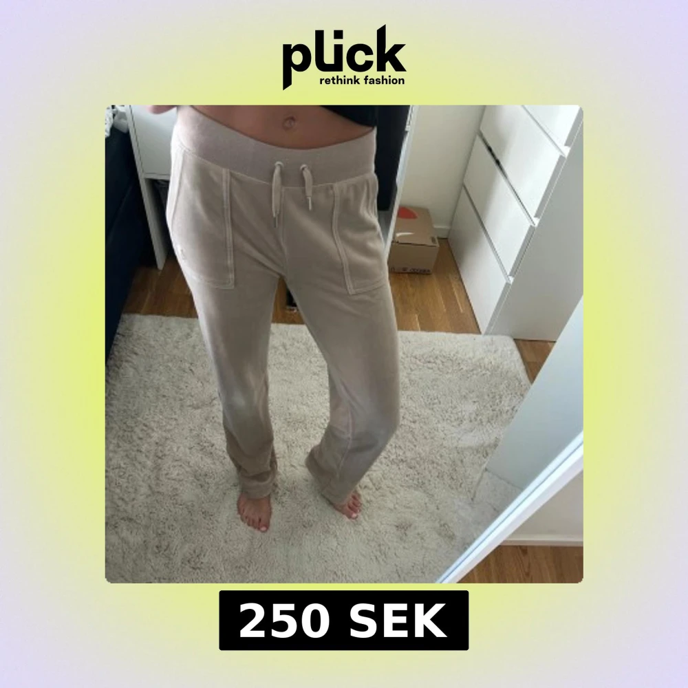 Säljer ett par beige mjukisbyxor från Juicy Couture i storlek XS. Byxorna har bred resår i midjan med snörning, stora fickor fram och en bakficka med knapp. Materialet är mjukt och skönt, perfekt för chill dagar. Snygg loose passform och klassisk Juicy Couture-vibe.