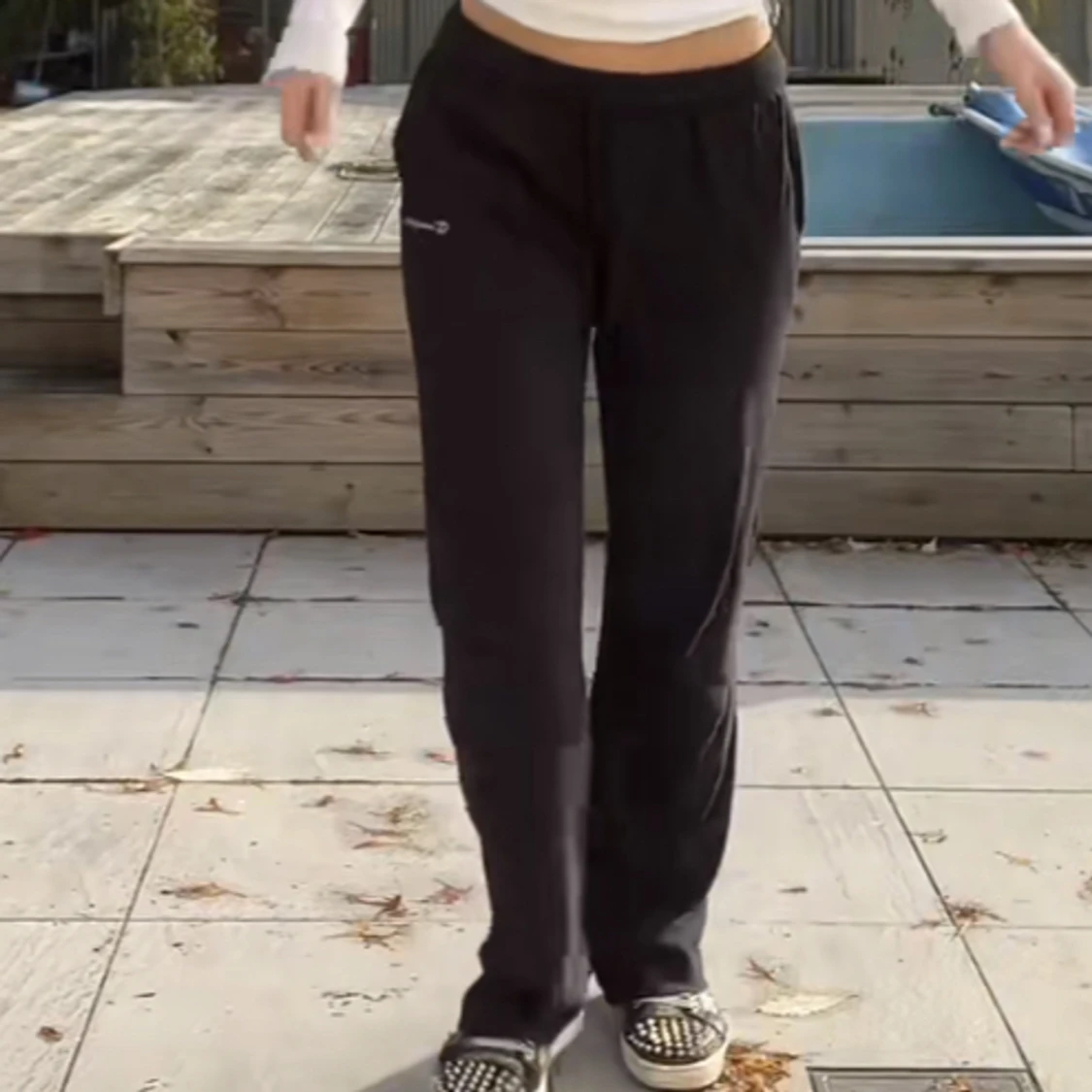 Säljer dessa svarta lågmidjade Champion mjukisbyxor i fint skick. Dom är uppsprättade där nere så att dom skulle bli längre!