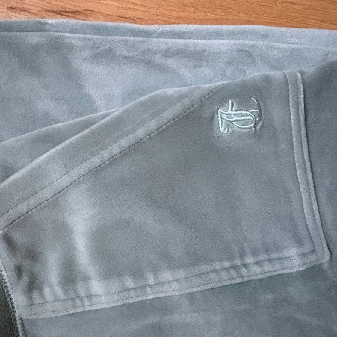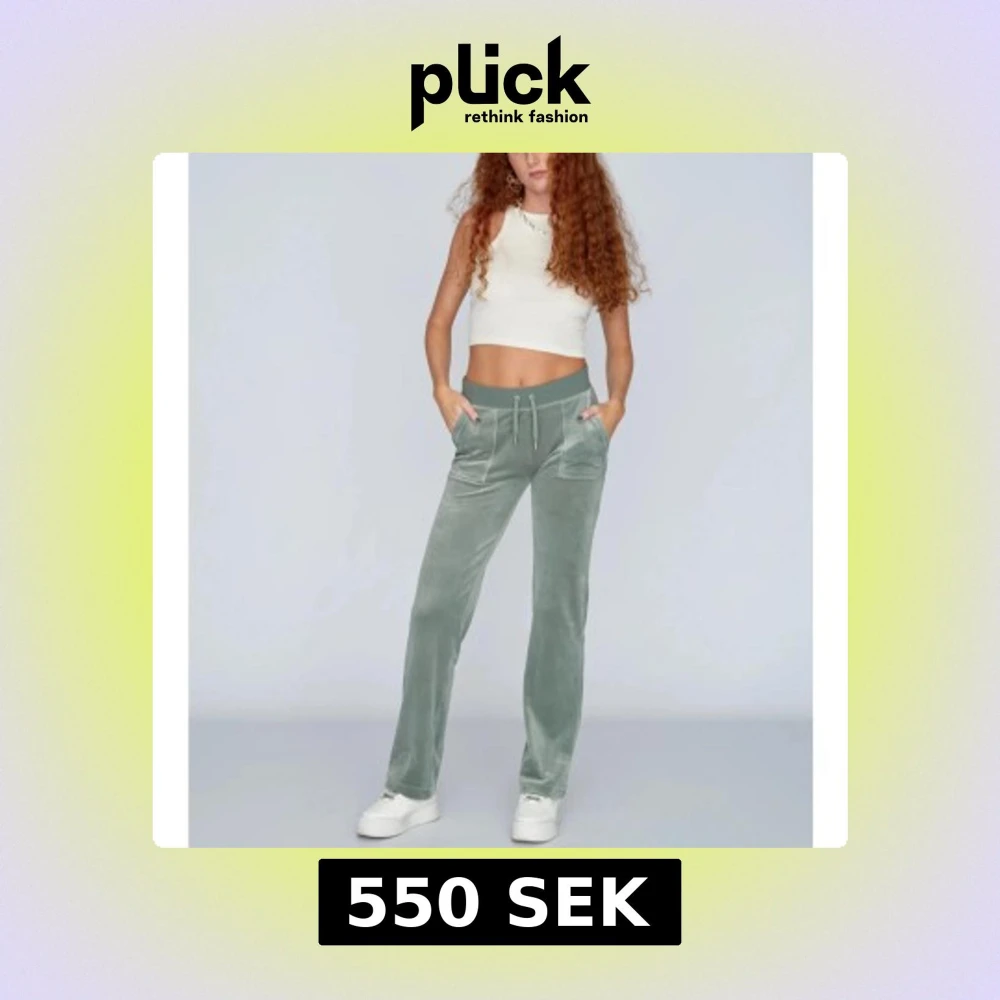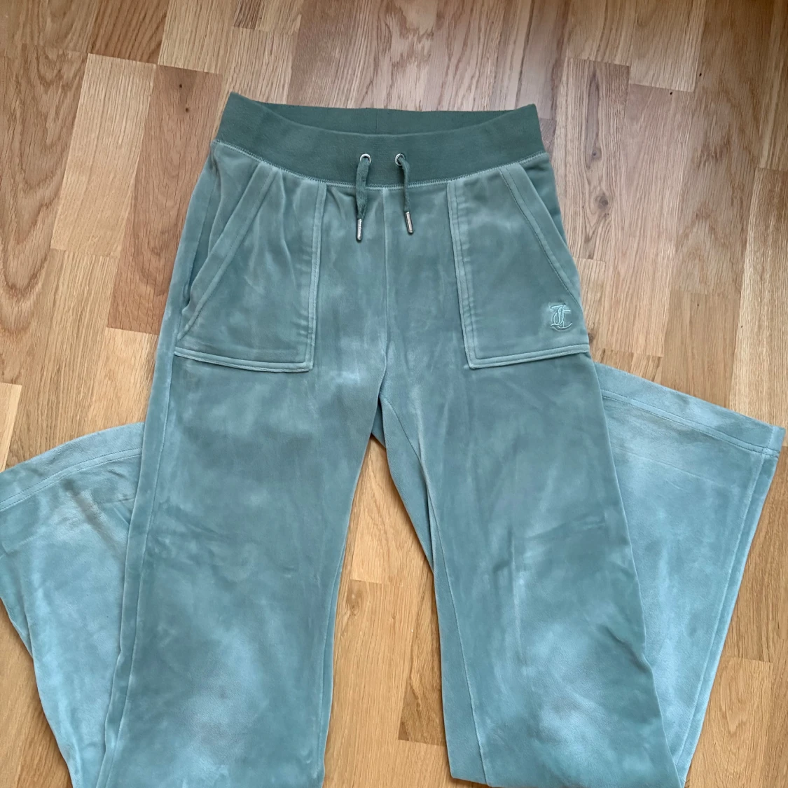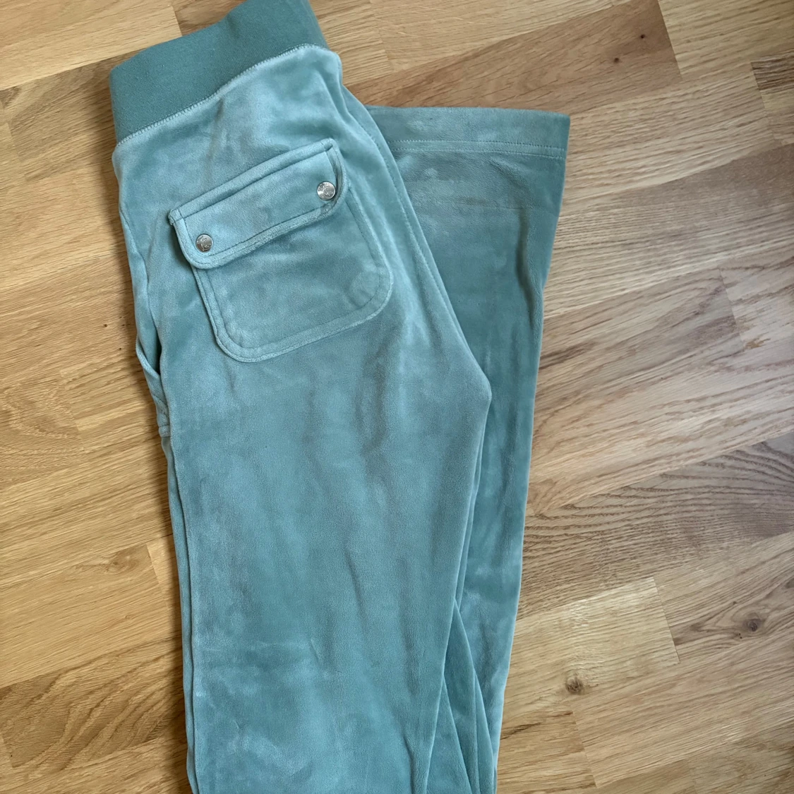 Ljusgröna mjukisbyxor från Juicy Couture i supermjuk velour. De har raka ben, stora fickor fram och fickor med knappar bak. Jättebra skick trots användning flertal gånger