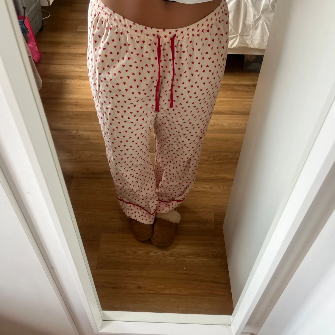 Säljer mina fina eftertraktade mjukisbyxor med hjärt mönster från Monki. I storlek M, skriv vid frågor!❤️