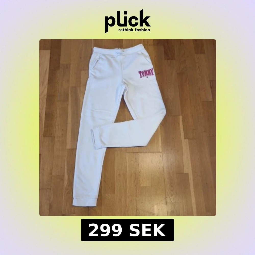 Säljer ett par vita mjukisbyxor från Tommy Hilfiger med broderad logga i rosa. Byxorna har en bekväm passform med resår i midjan och muddar vid bensluten. Perfekta för en avslappnad stil.