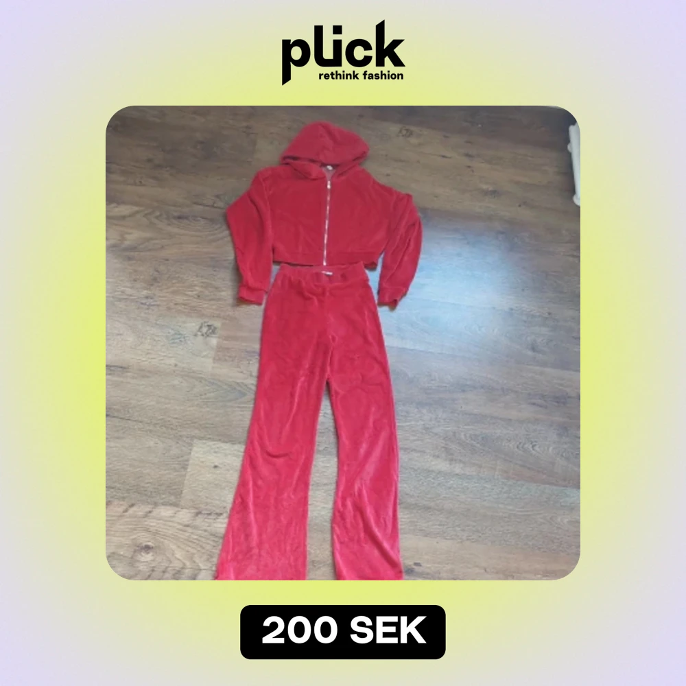 Oanvänt rött mjukisset, högmidjade byxor i XS och kort zip up hoodie i Small. Mjuk och skönt.