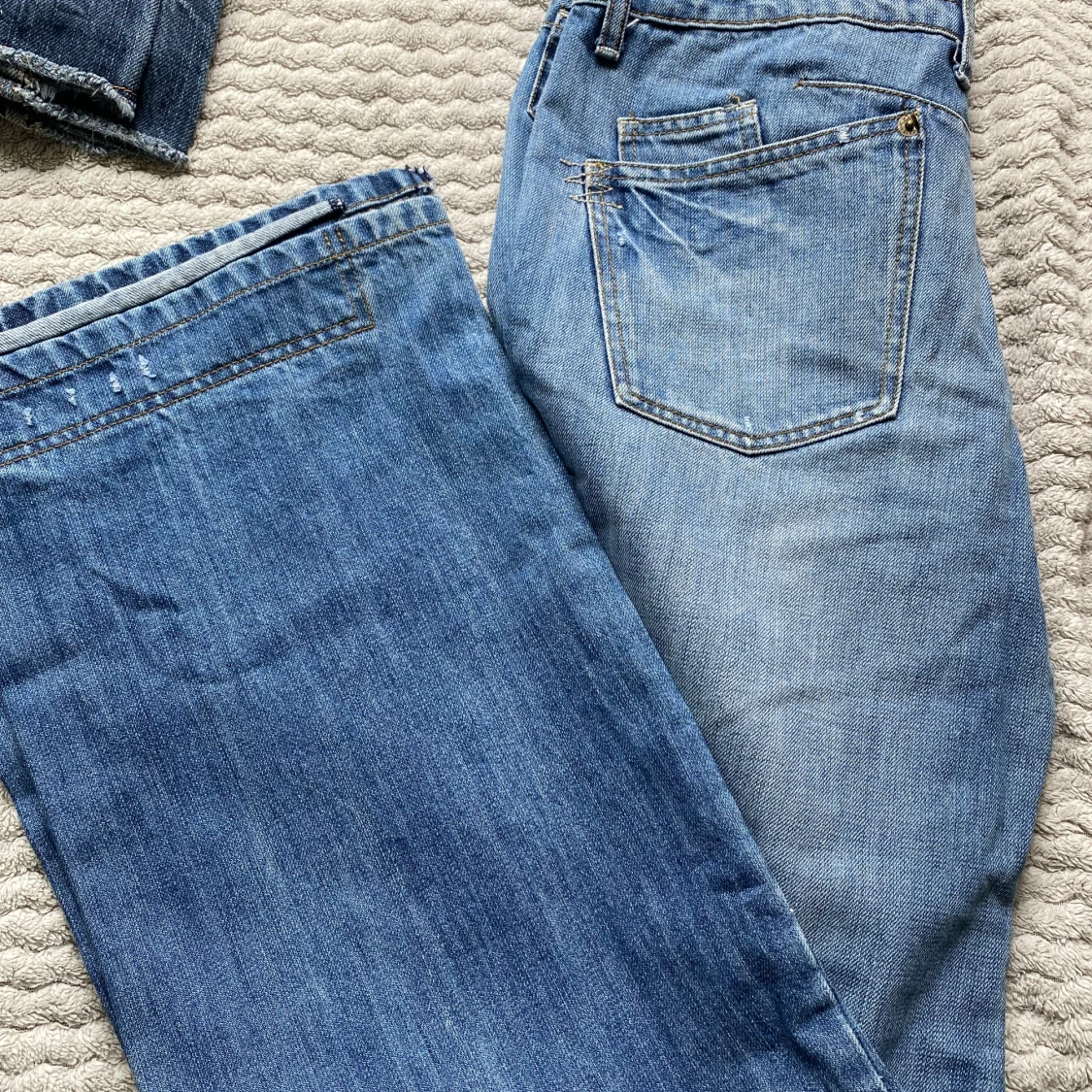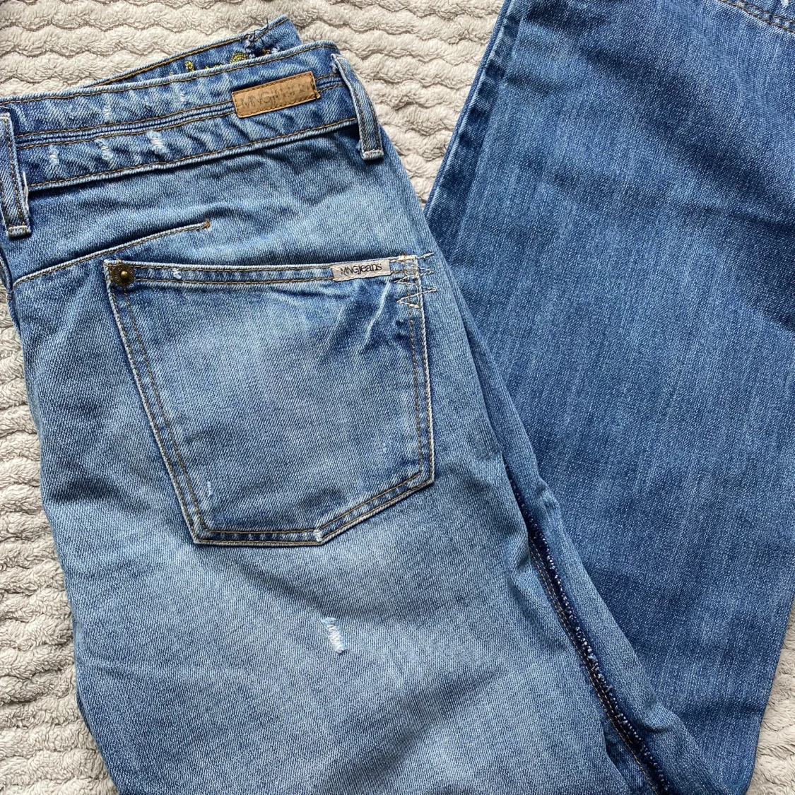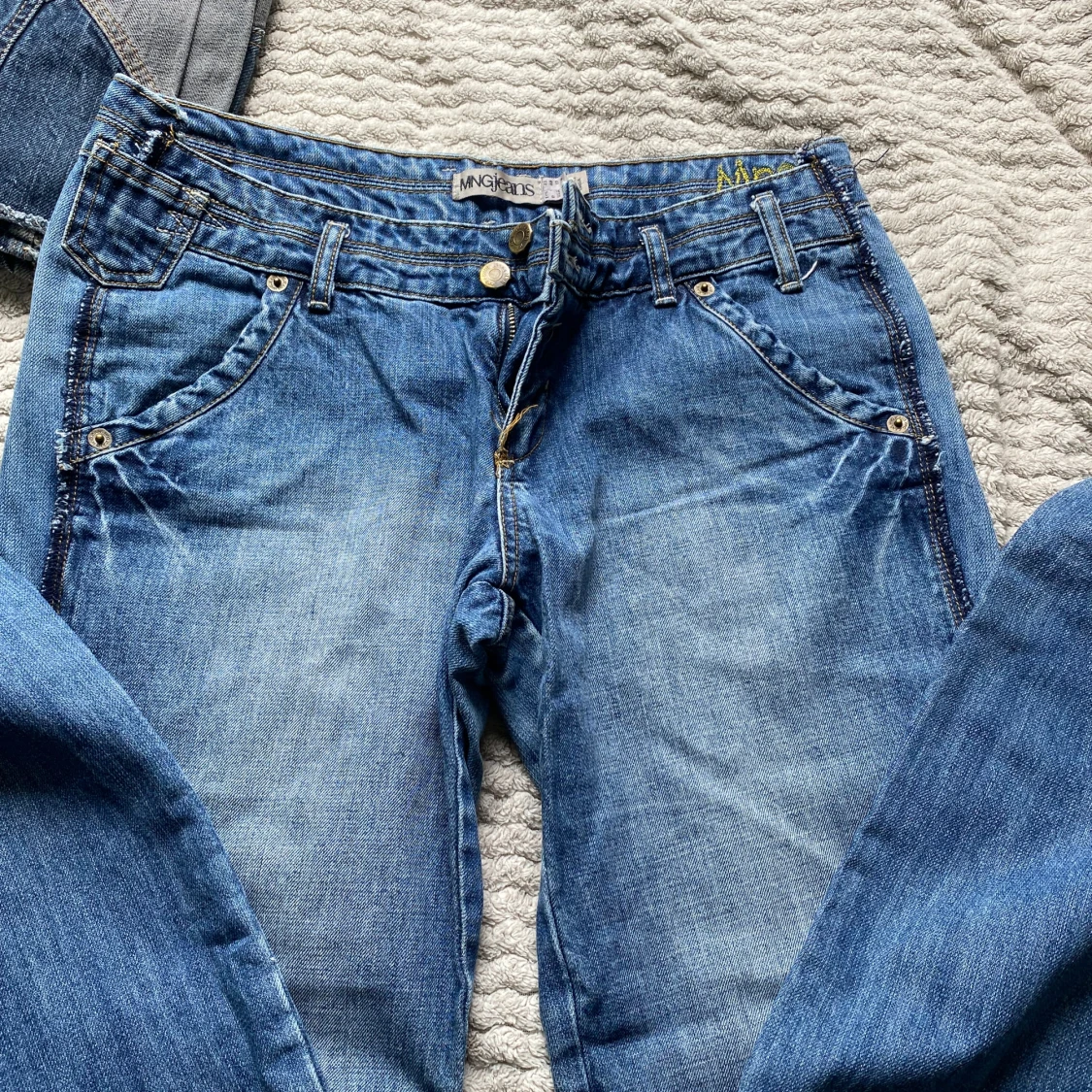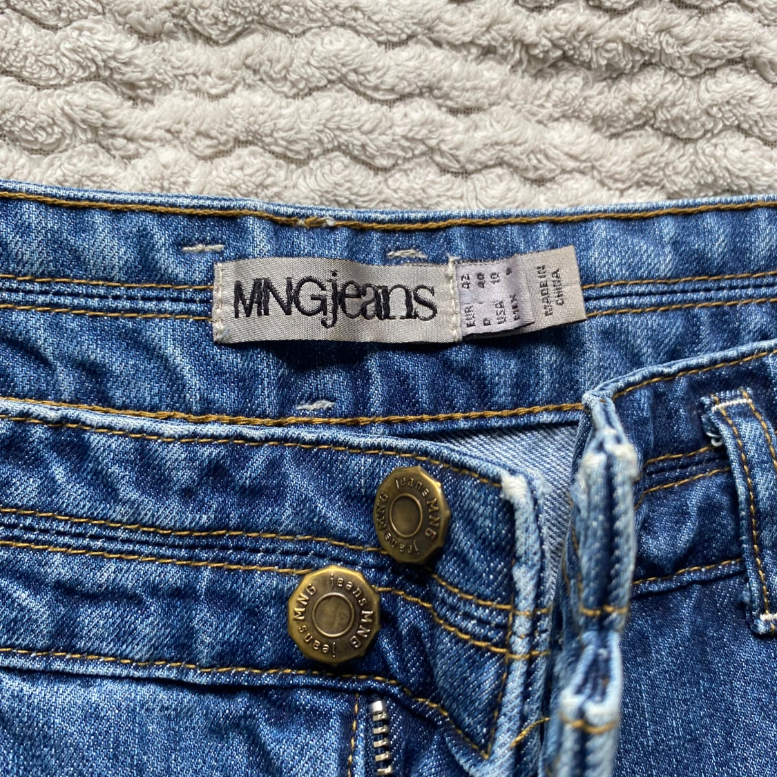 Säljer ett par klassiska blå jeans från MNGjeans med normal passform. Med dubbla knappar i midjan och snygga detaljer i guldmetall. Lite baggy och låg i midjan.