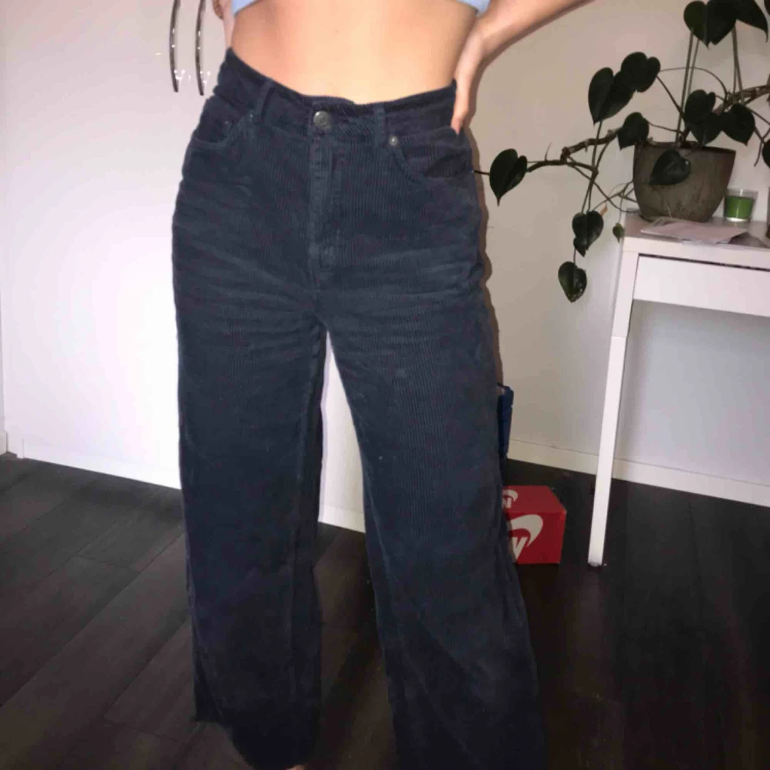 Marinblåa Manchester byxor från Vera Moda. I nyskick och knappt använda. Säljer du dom mest tar plats i garderoben. Rak model med väldigt hög midja. Slitningar längst ner på benen.