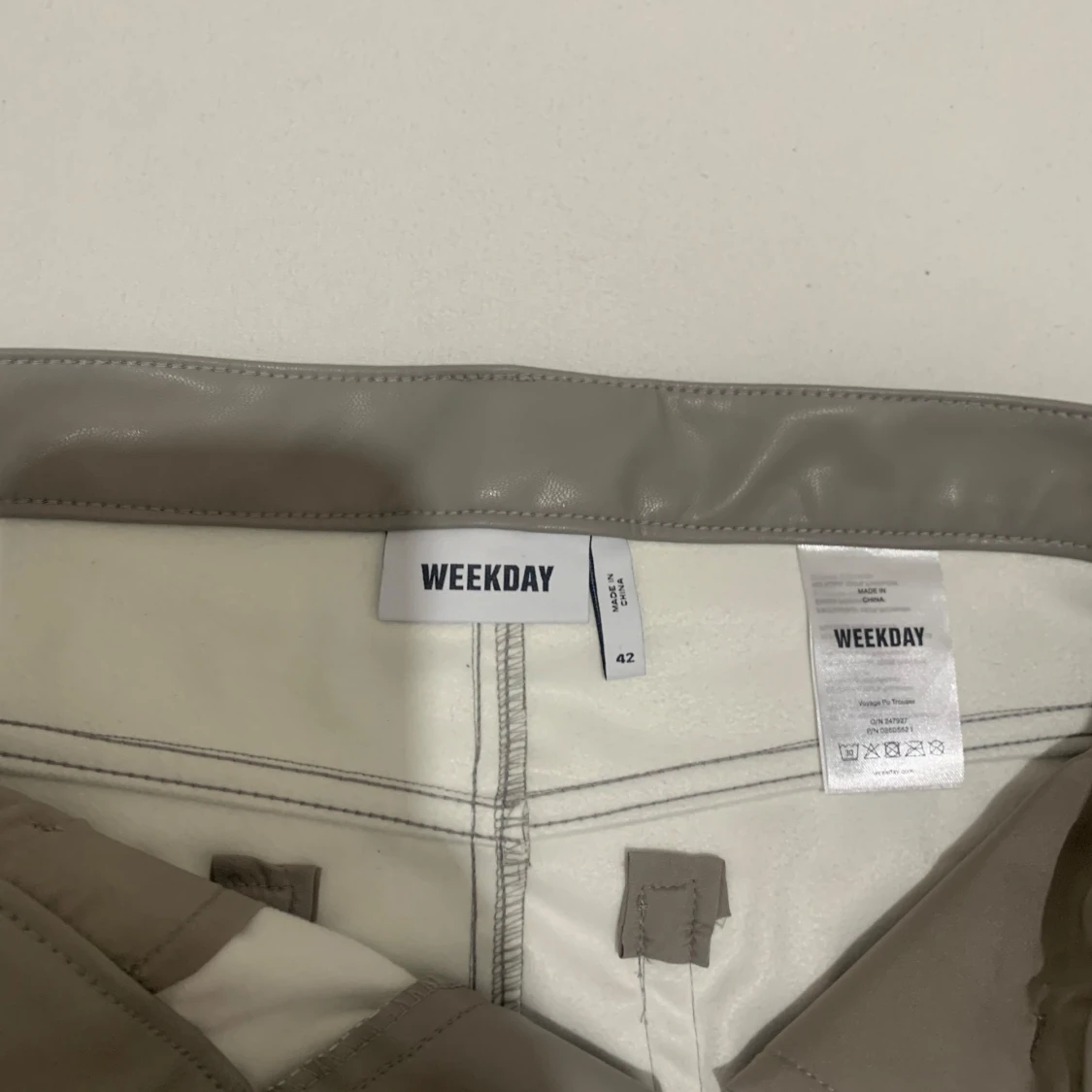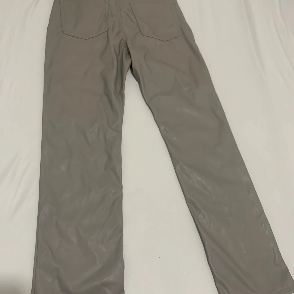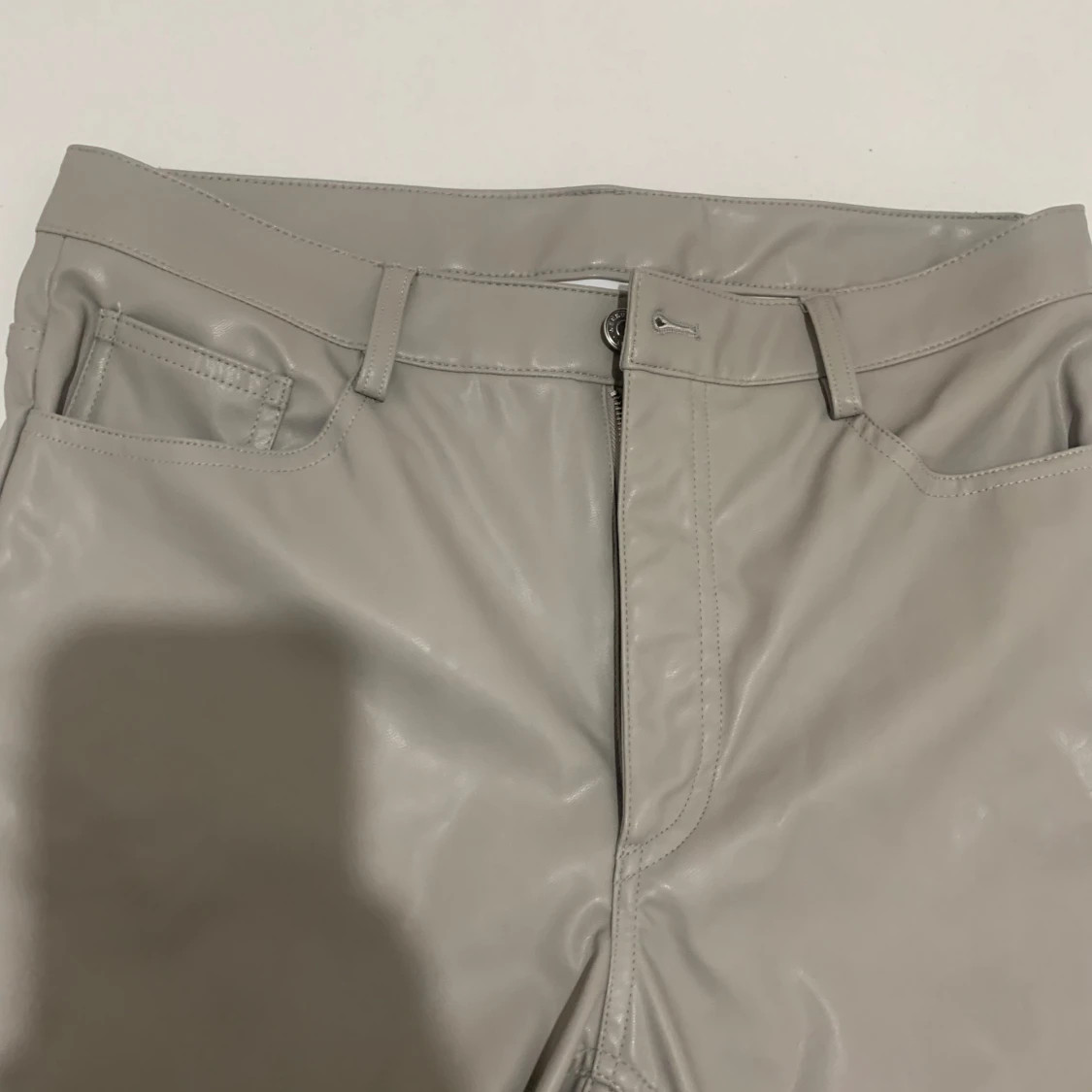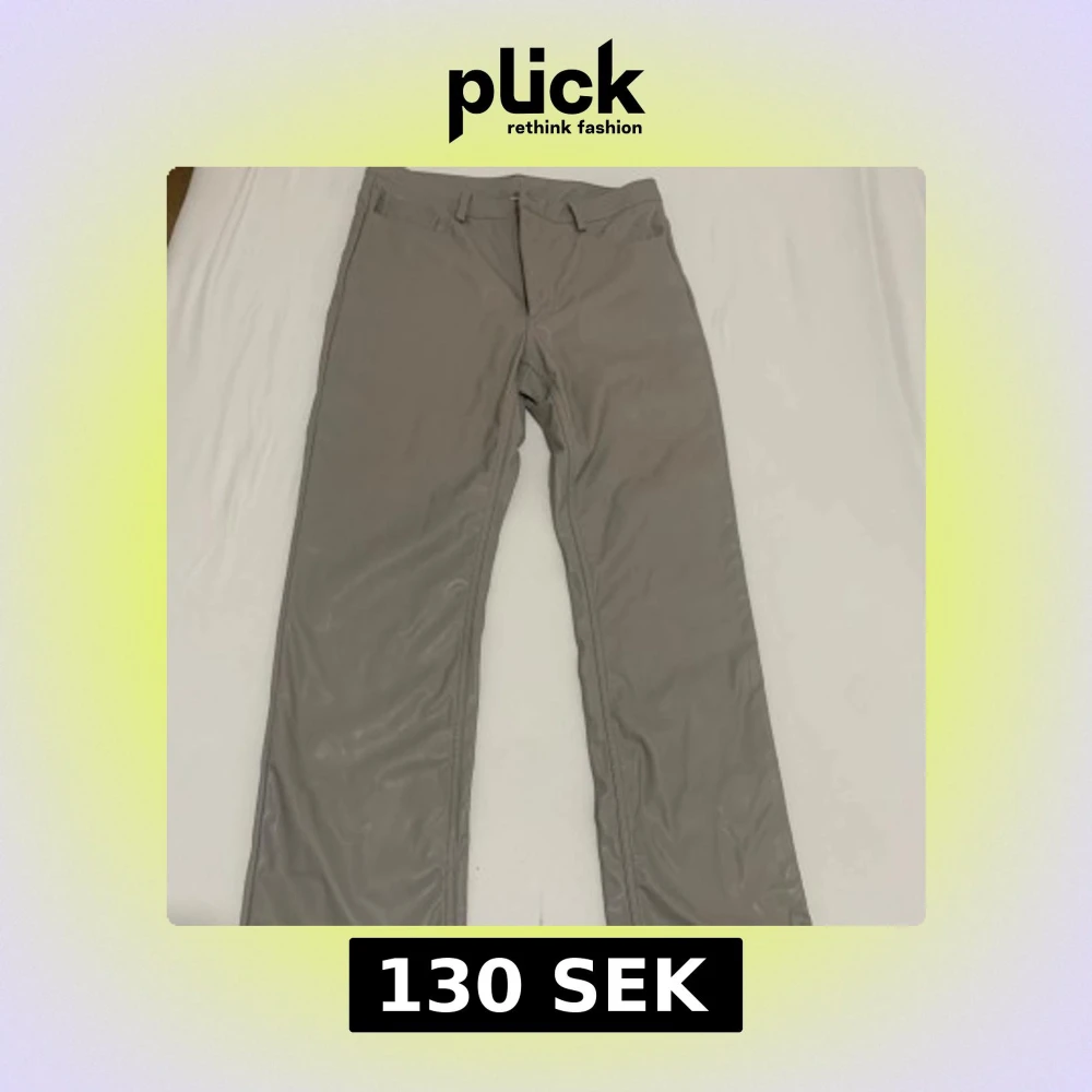 Snygga gråa skinnbyxor från Weekday med raka ben och klassisk femficksmodell. Byxorna har bälteshällor, dragkedja och knapp framtill. Materialet är syntetiskt skinn som ger en cool och modern look.