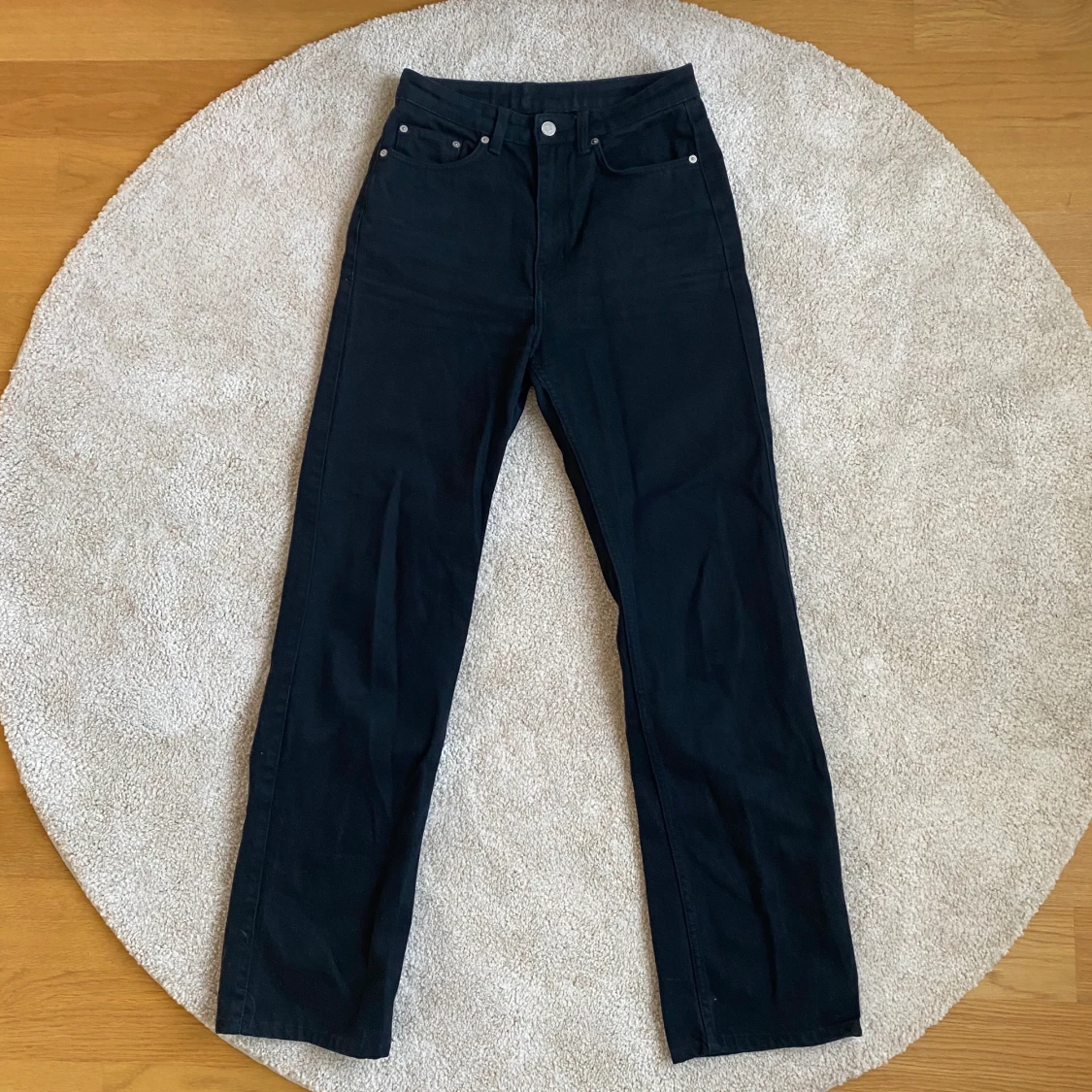 Svarta jeans från weekday i modellen ”Rowe”, en rak modell som är väldigt populär. Jeansen är ganska flitigt använda men har fortfarande bra färg och är inte urtvättade. De säljes då de är för små i storleken för mig. Original pris är 500kr💓💓