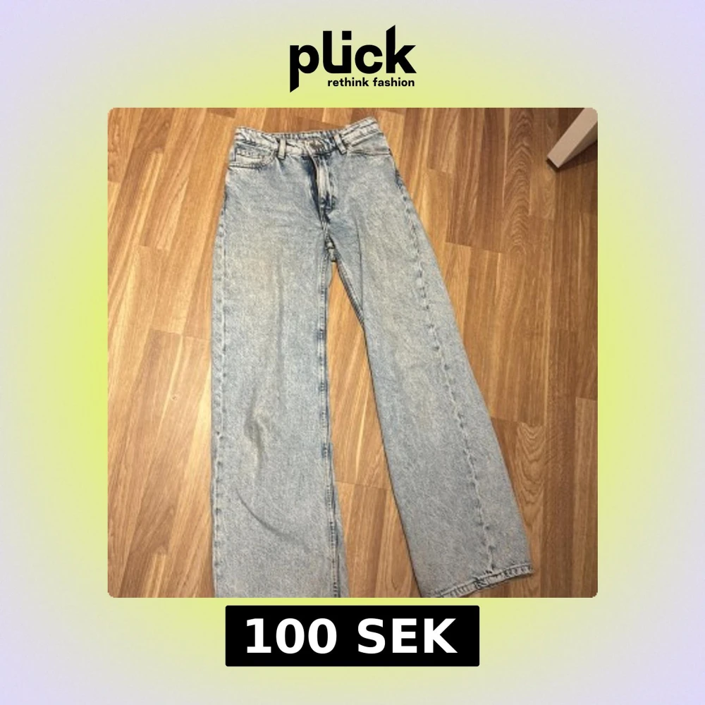 Säljer ett par ljusblå jeans från Monki i storlek 25. De har en rak och wide passform med hög midja och klassiska fem fickor. Jeansen är tillverkade i bomull och har en snygg tvättad look med Monki-lapp bak i midjan.