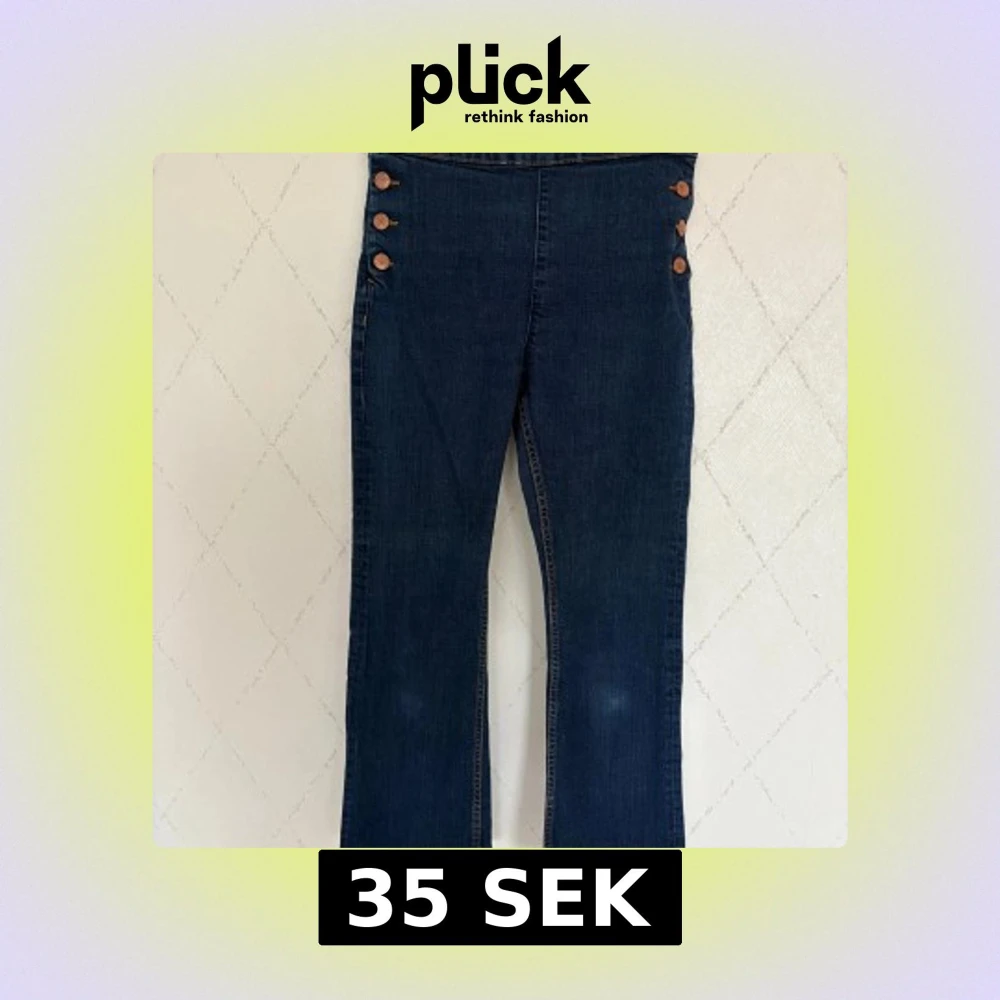 Mörkblå jeansbyxor från Monki med snygga kopparfärgade knappar på sidorna och raka bakfickor. Byxorna har hög midja är tillverkade i klassiskt jeansmaterial. Perfekta för dig som gillar en stilren men ändå unik look.