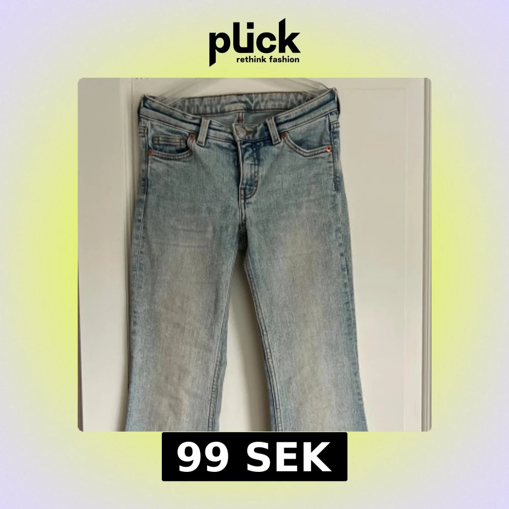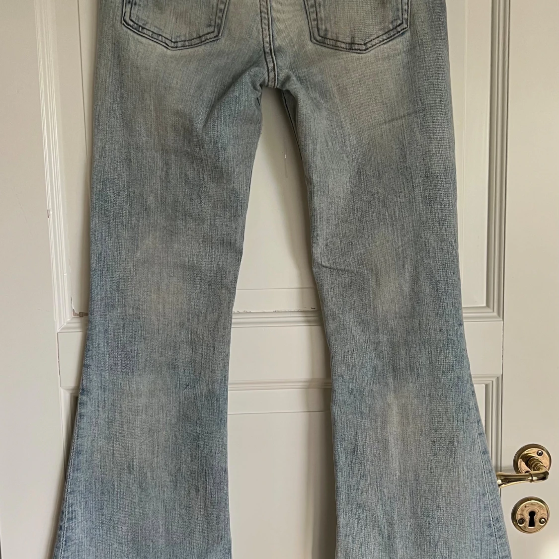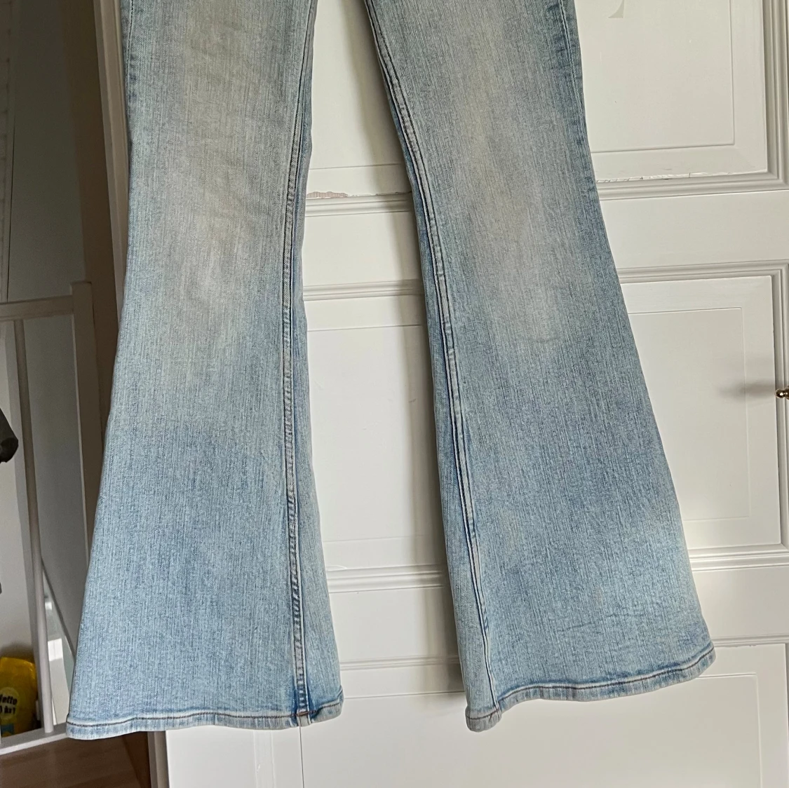 Säljer ett par ljusblå jeans från Monki med bootcut-modell och klassisk femficksdesign. Jeansen har en snygg tvättad look och är tillverkade i jeansmaterial med normal passform upptill och utsvängda ben. Stl 24/32