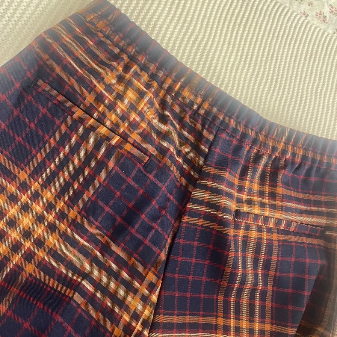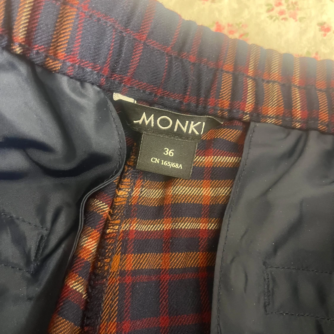 Snygga rutig byxor från Monki i marinblått, rött och orange. Skriv till mig för fler frågor om mått eller annat!💗