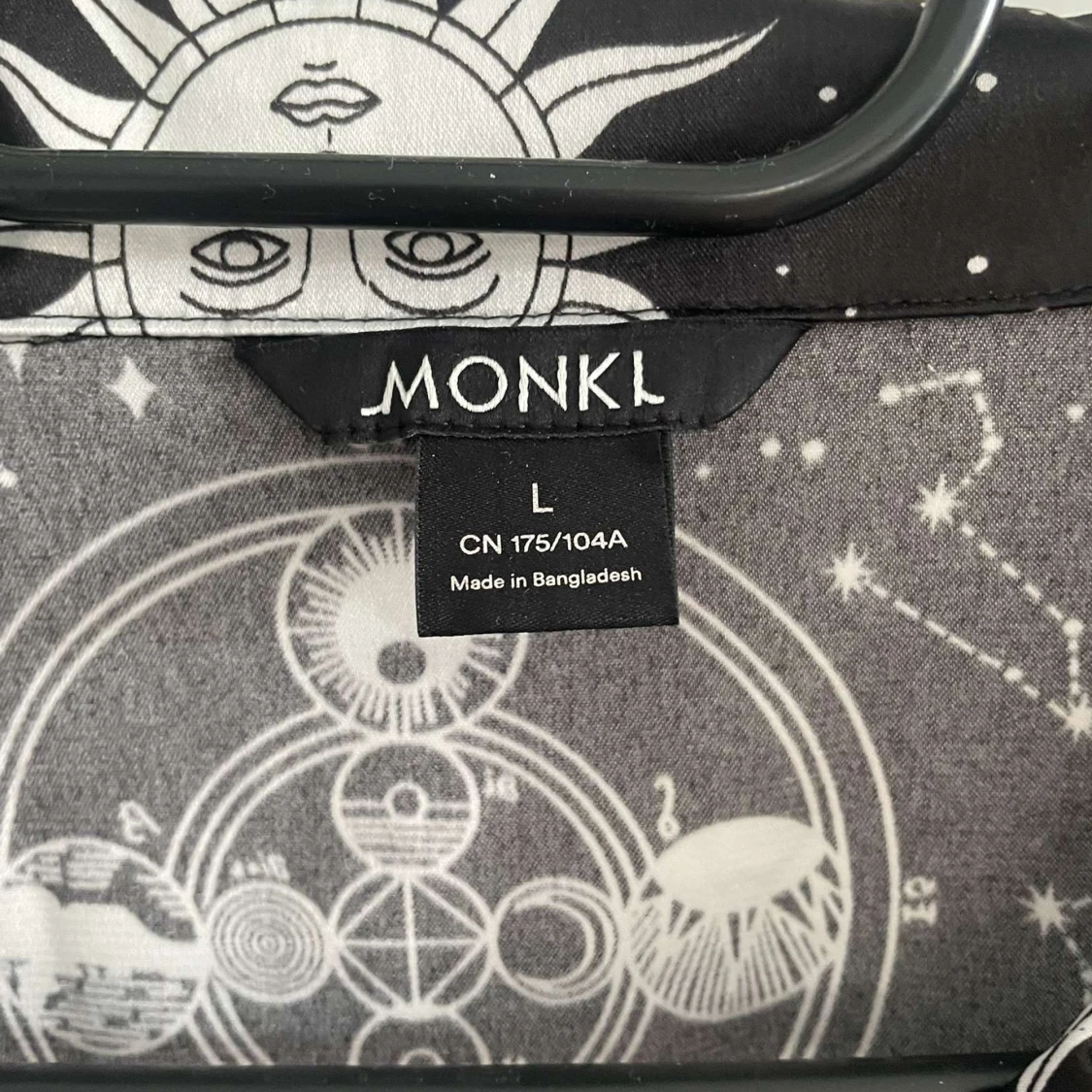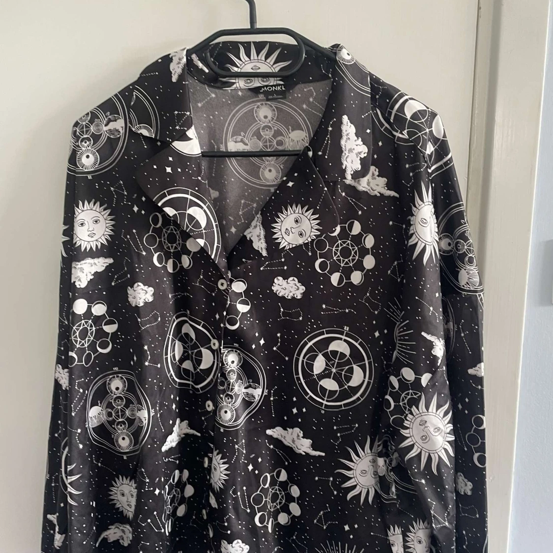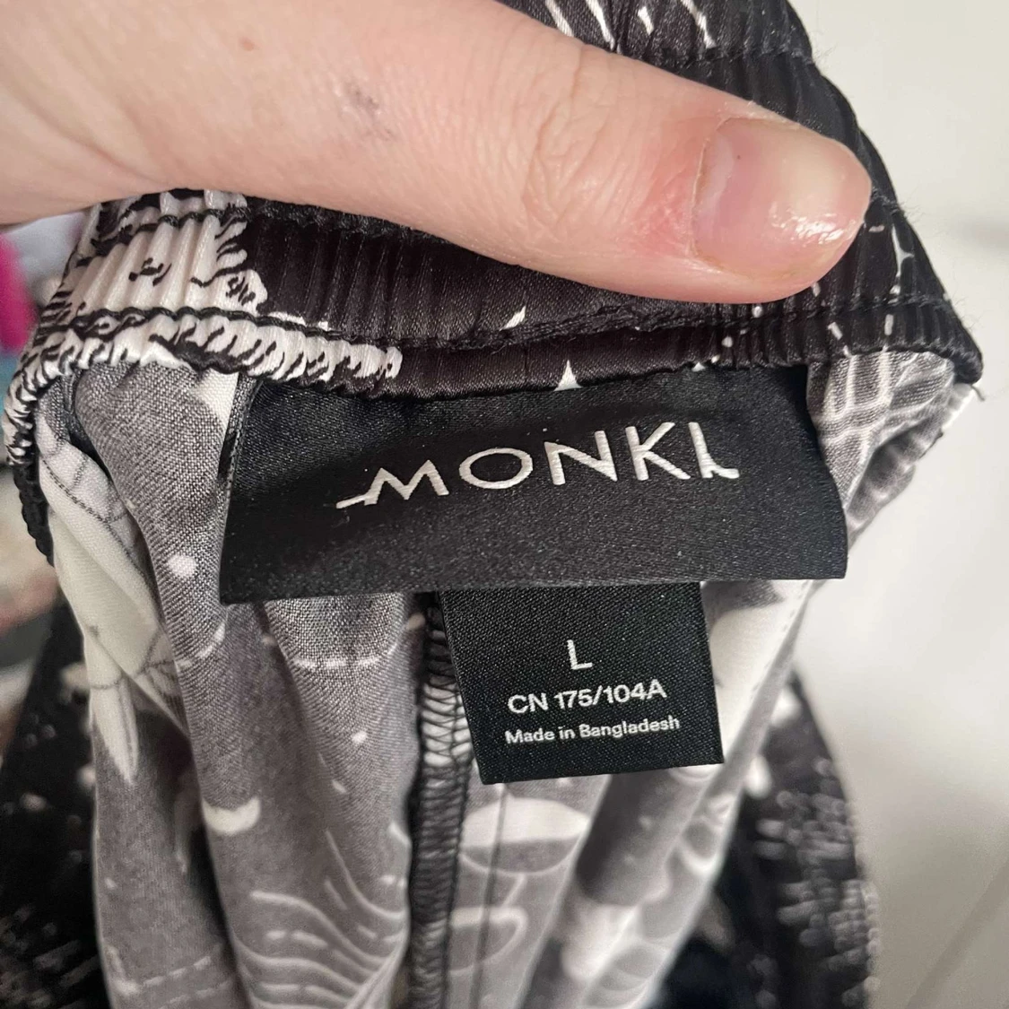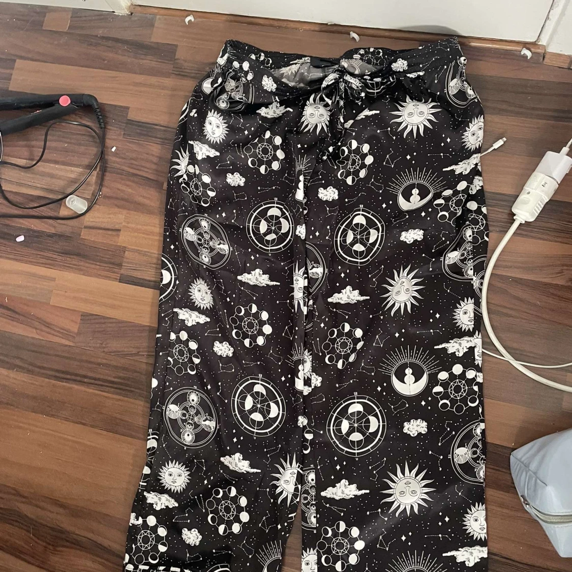 Säljer ett par svarta byxor från Monki med vitt astrologiskt print med solar, månar och stjärnor. Byxorna har dragsko i midjan och är vida i modellen. Perfekta för dig som gillar unika och coola mönster!