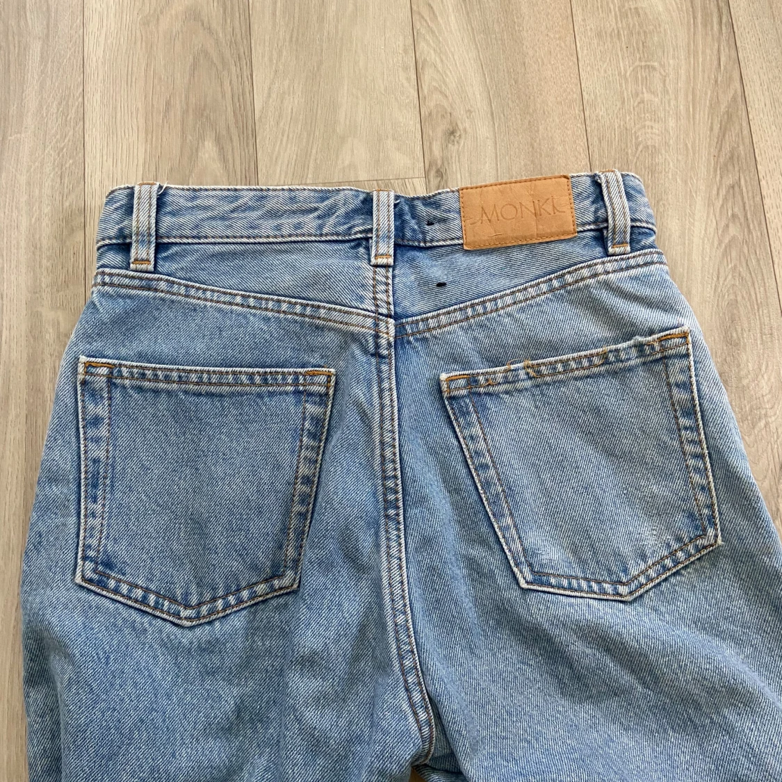 Snygga ljusblå jeans från Monki, modellen Kimomo High Relaxed. De har hög midja, raka ben och klassiska fem fickor. Små i modellen med smal midja🩵hör av dig vid frågor!
