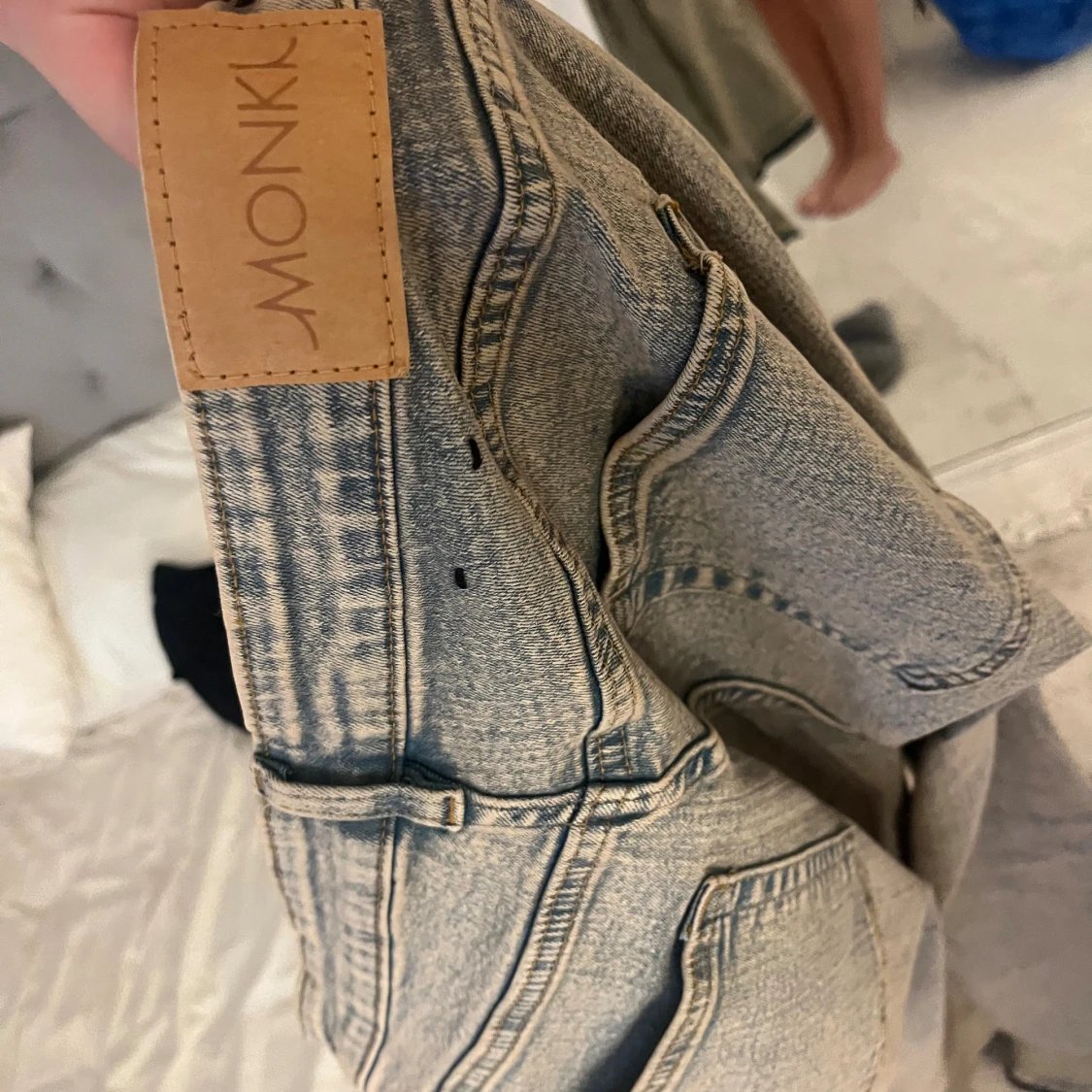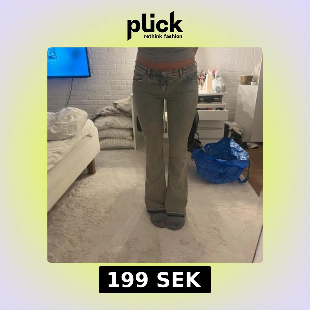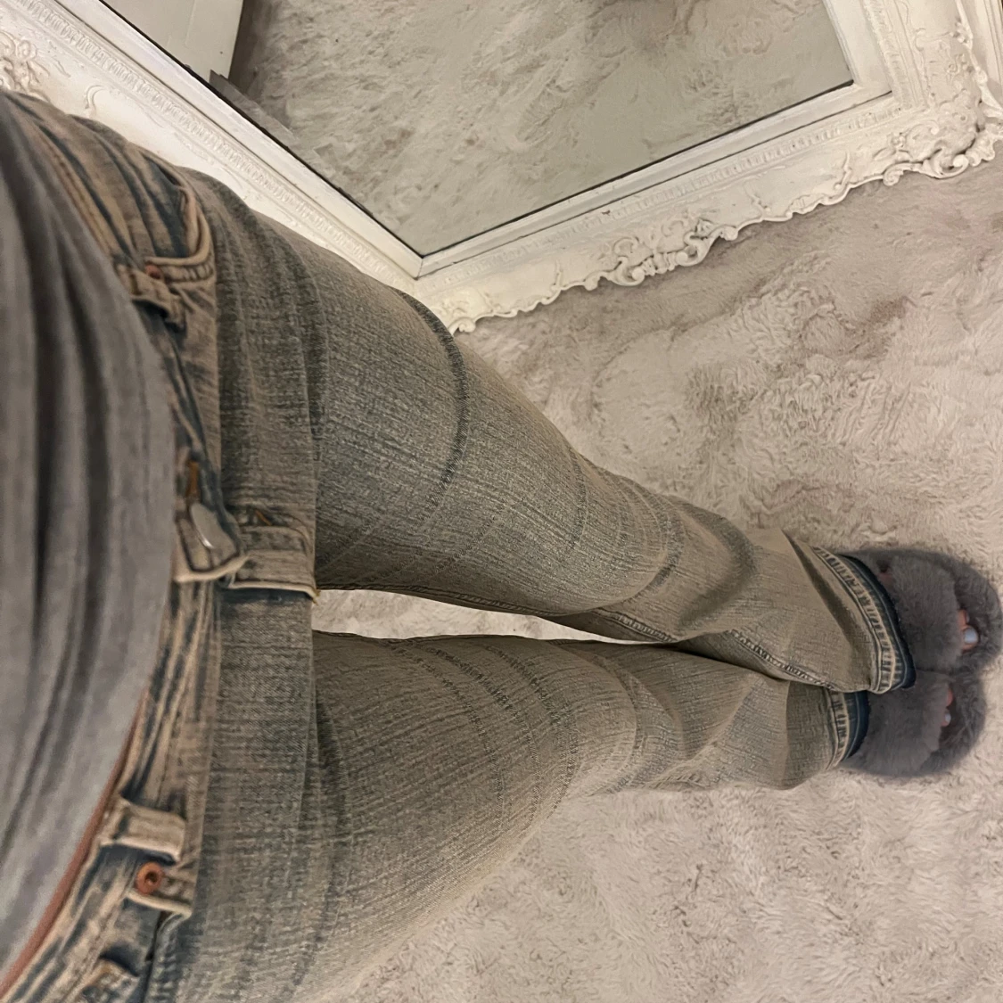 Säljer ett par grå jeans med snygg tvätt och låg midja. Modellen har bootcut-ben och klassiska fem fickor. Jeansen är i stretchigt denim och har en cool, lite sliten look. Perfekta för dig som gillar en avslappnad men trendig stil.