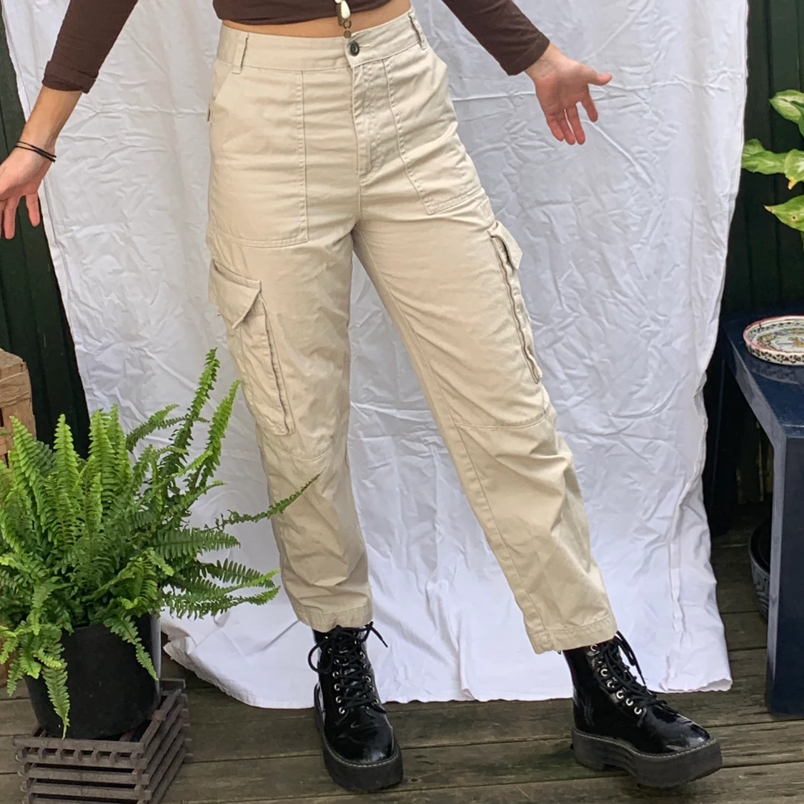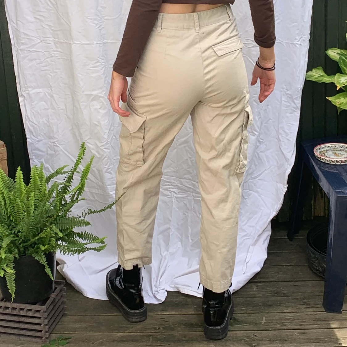 Cargoliknande beiga byxor, fyra fickor, funkar på mig som är st S, men sitter lite tajt och hade funkat bättre på xxs-xs