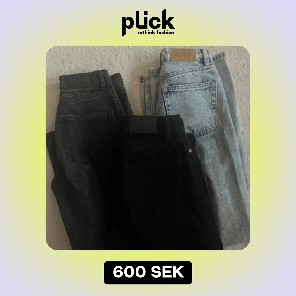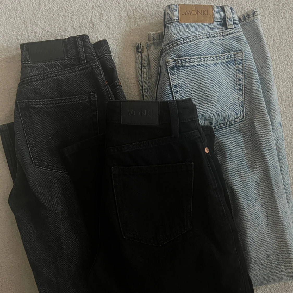 Säljer 3 st jeans från Monki med rak passform i färgerna svart, grå och blå 🖤🩶🩵Storlek: 25 (passar mig som är XS/S). Kan köpas separat för 200 kr/st också.