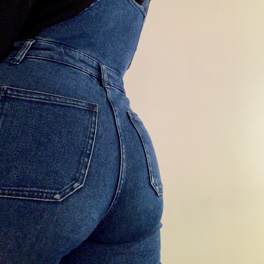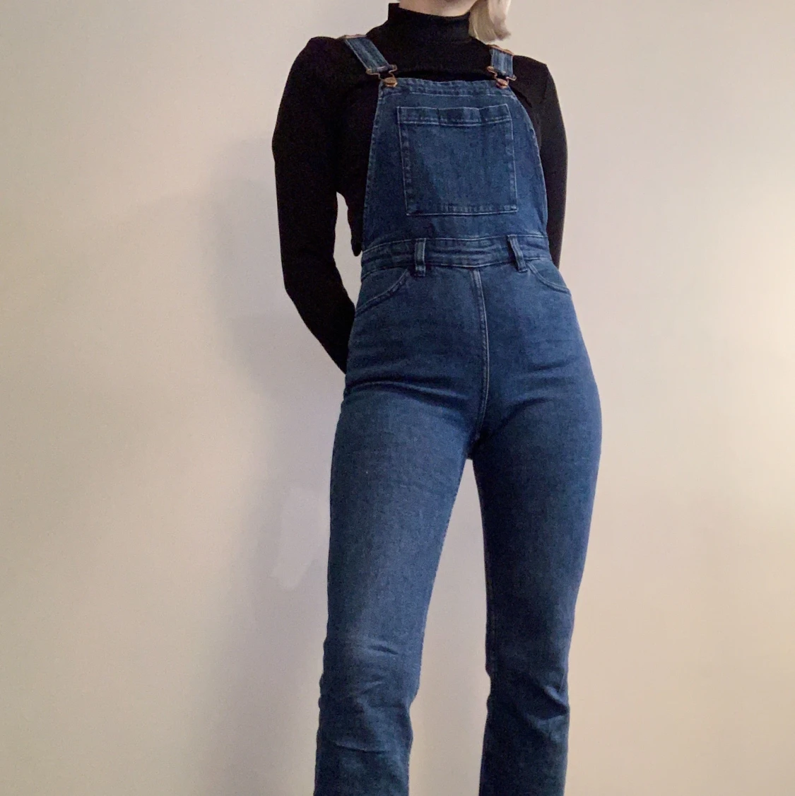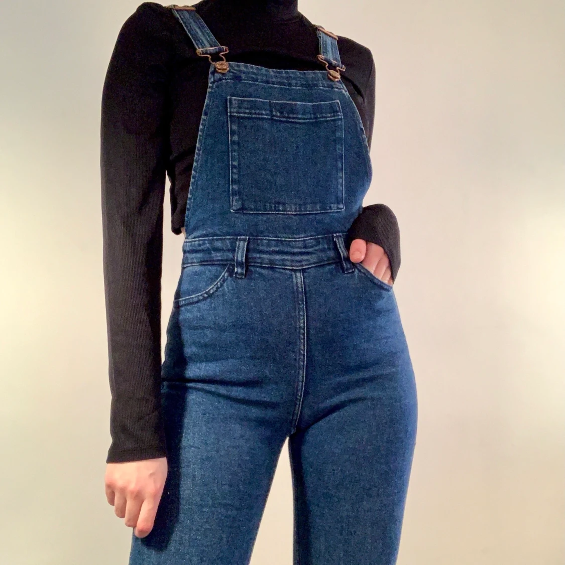 Croppade hängselbyxor från Monki. Skönt stretchig denim. Strl 34. Midjemått 72 cm, längd 88 cm. Frakt 66 kr.