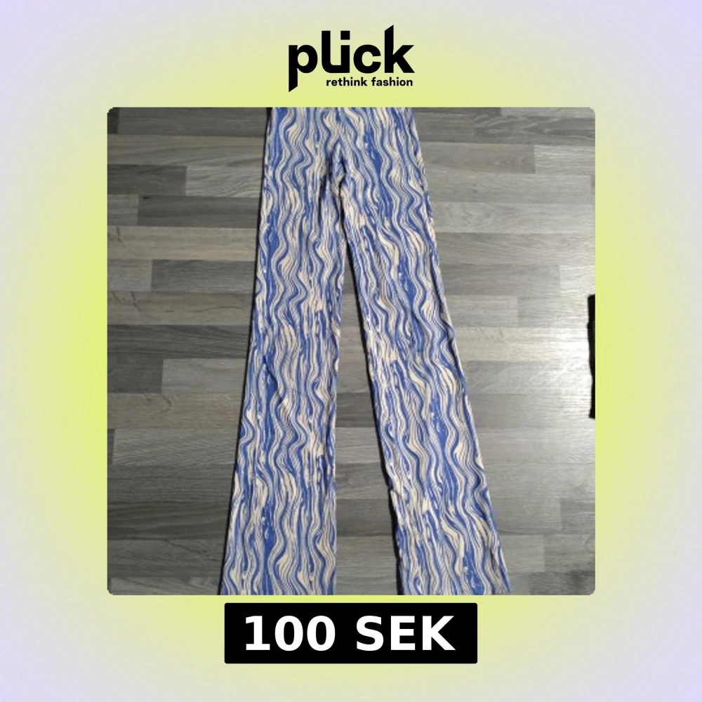 Säljer ett par unika byxor från Monki i storlek XXS med blåvitt/beiget vågigt mönster. Lite bootcut, tillverkade i ett stretchigt, mjukt material som sitter skönt. Perfekta för dig som gillar att sticka ut med coola mönster och färger.