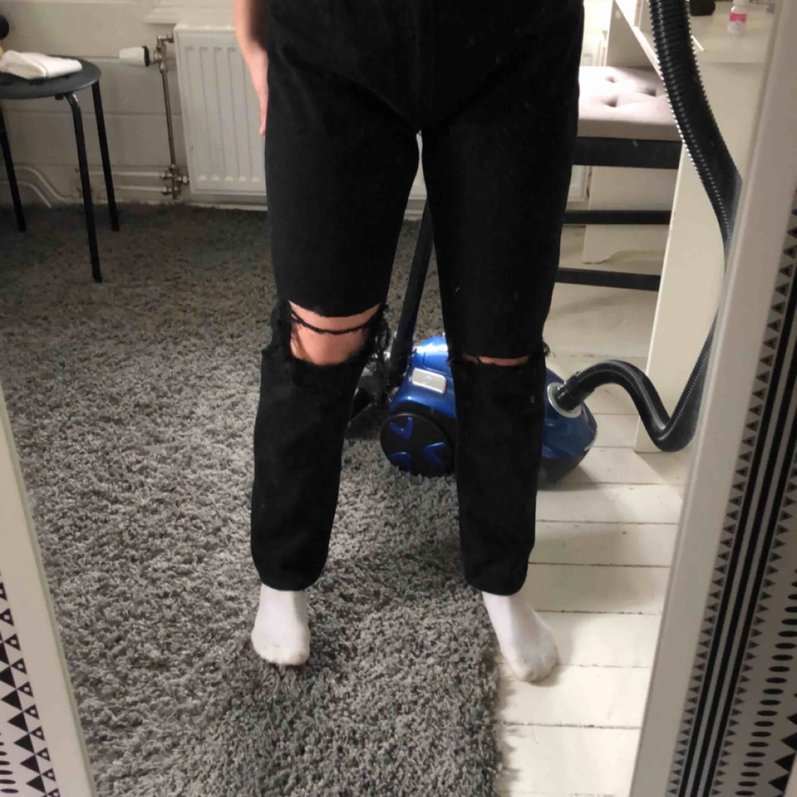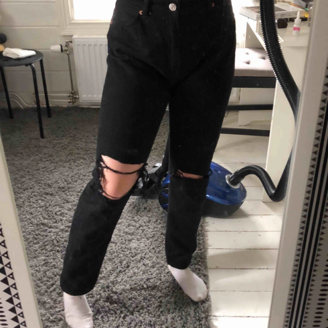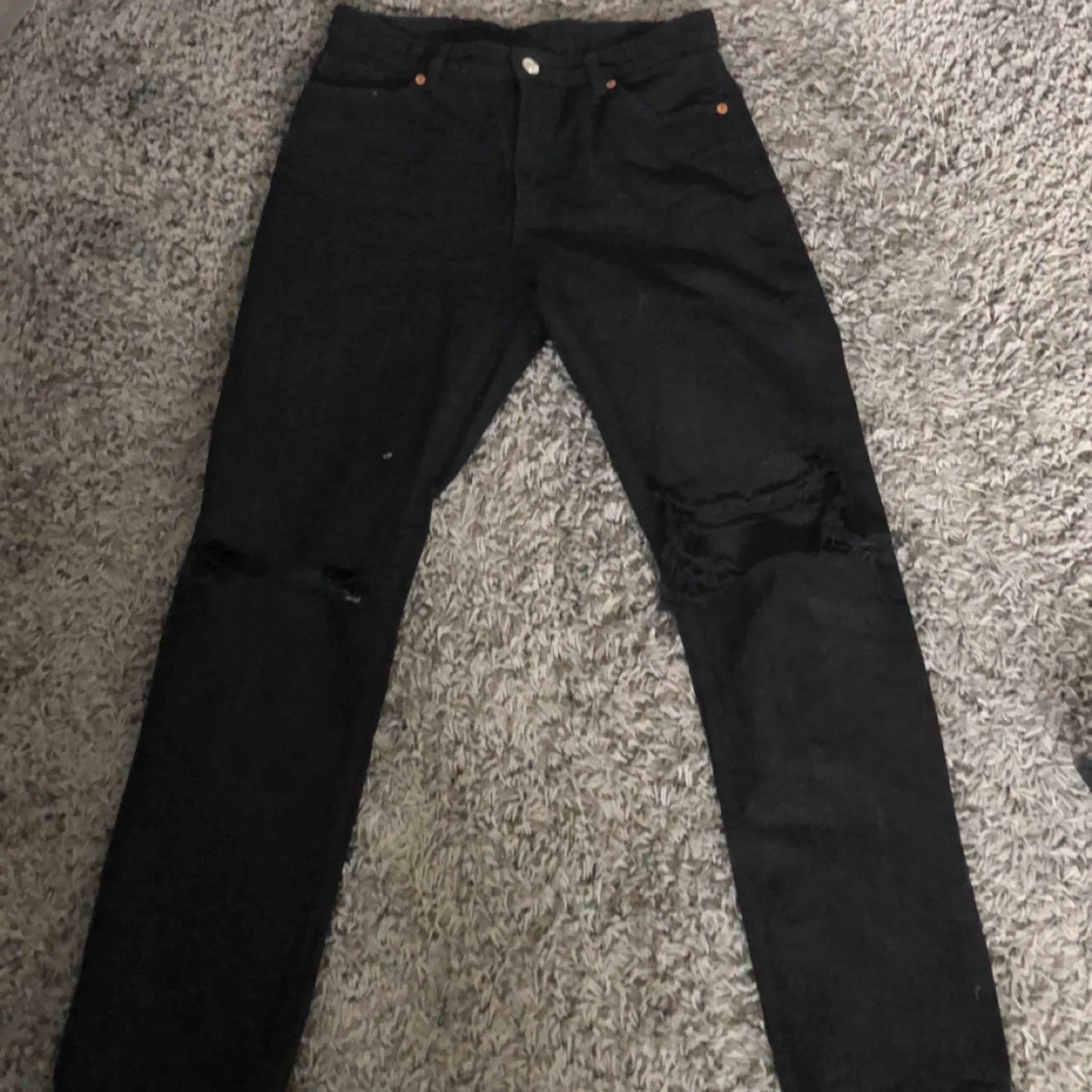 Ett par snygga jeans från Monki med egen gjorda hål, dom är tyvärr lite för stora för mig som är en storlek 25 egentligen, står att de storlek 28 men skulle mer säga att de passar en 27 och kanske en 26:a också. Köparen står för frakt