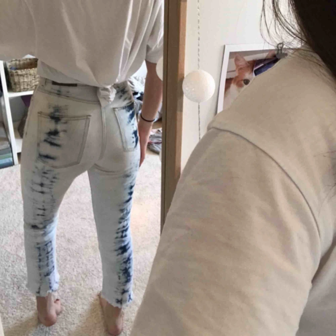 Vita jeans med blåa ”fläckar” från monki. Korta i benen! Hög midja! Använda ett fåtal gånger. Bida från 150 kr