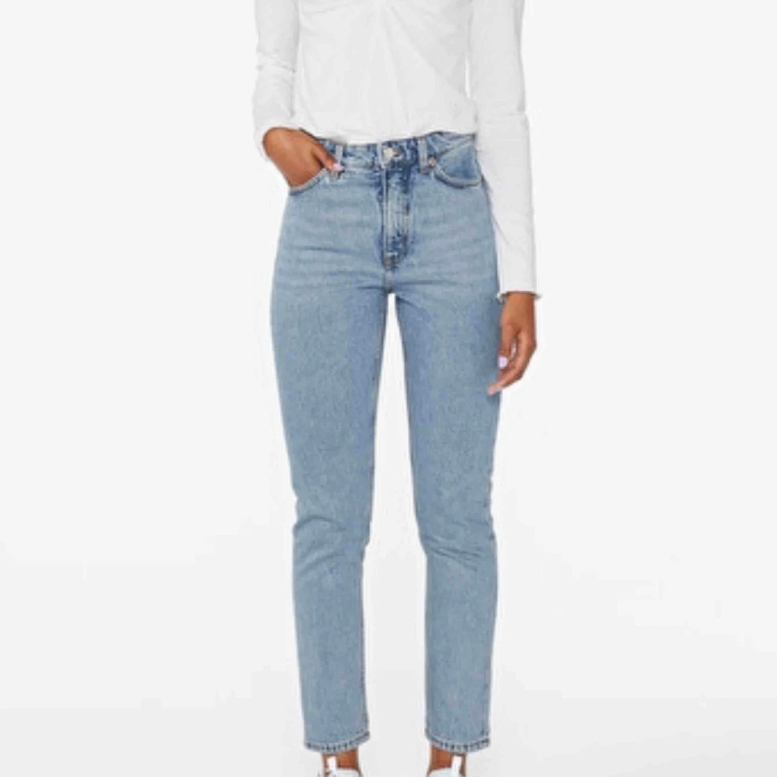 Blåa jeans i modellen kimono från Monki. Storlek 25. Jag är strax under 170 cm och har jeansen utan att vika upp. Bra skick och inte urtvättade!