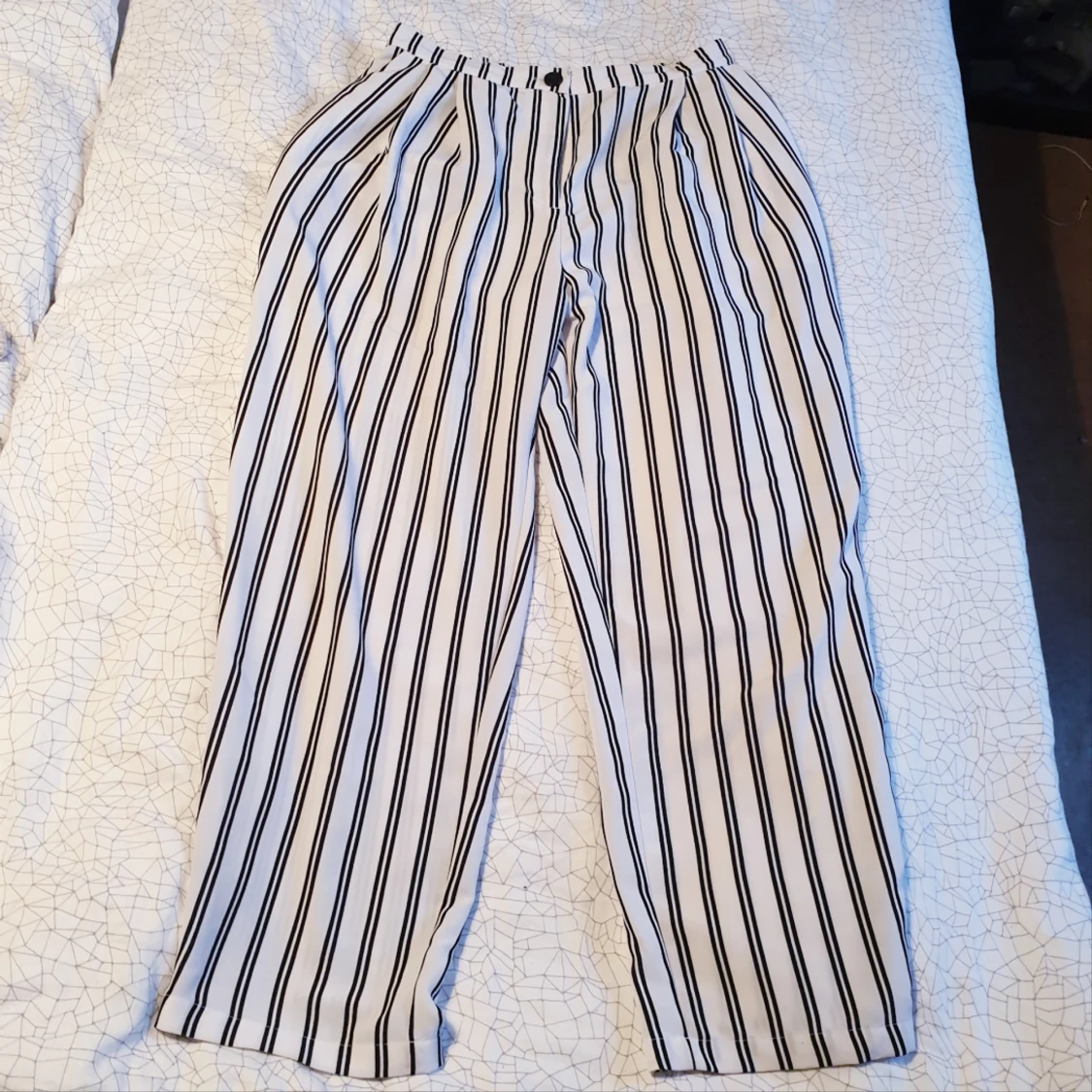 Supersnygga randiga kostymbyxor. Hög midja och lite croppade i längden, 2 fickor Resor i ryggen så kunnat använda dem när jag varit från storlek 36-40 Skickas (max 37kr frakt) eller möts i Göteborg.