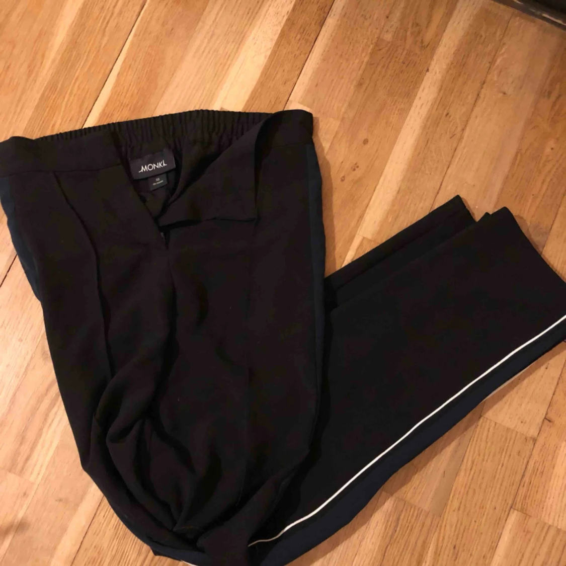 Svarta byxor från Monki med en blå och vit rand på sidorna. Något vida nertill, skönt material. Använda kanske 3 gånger.